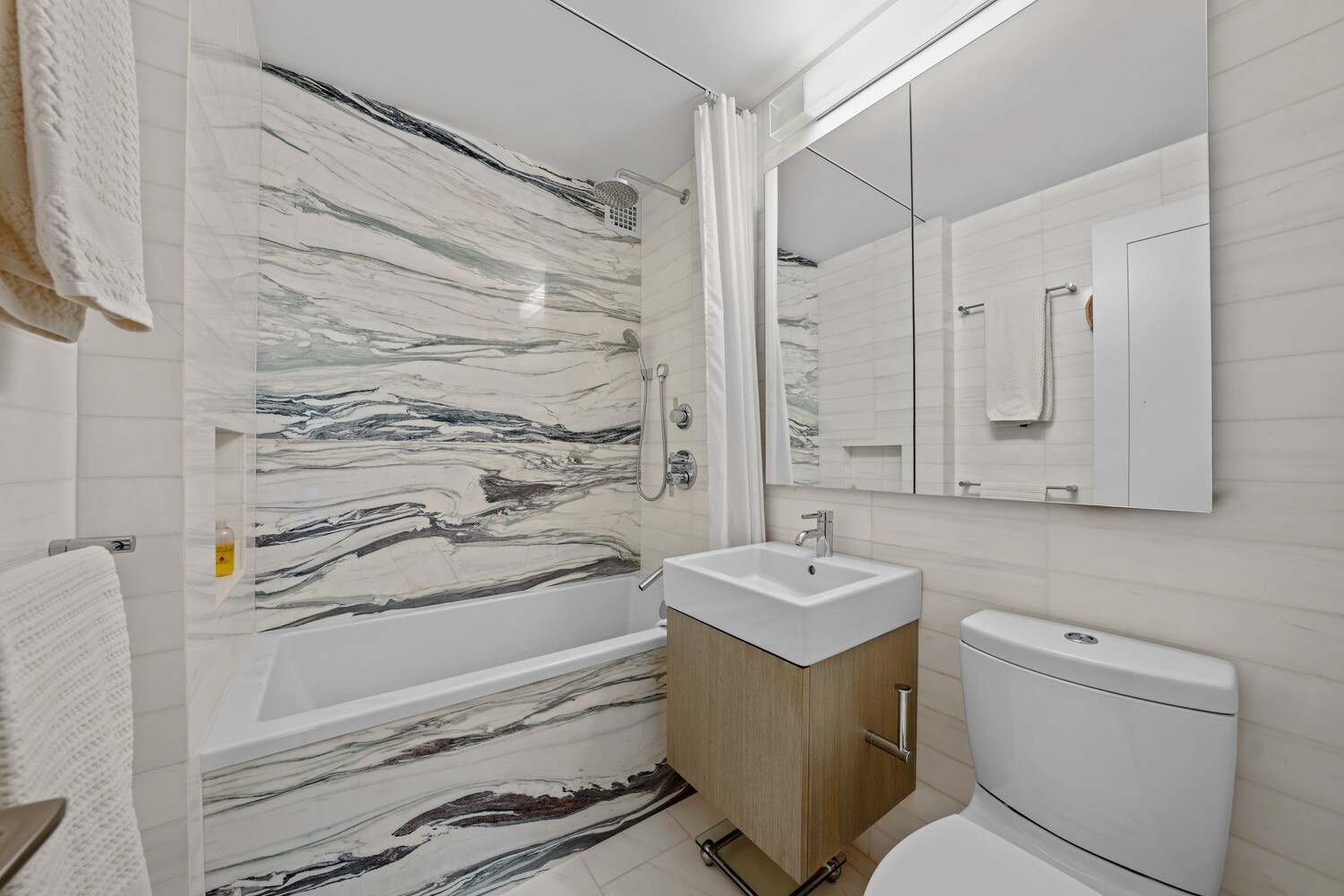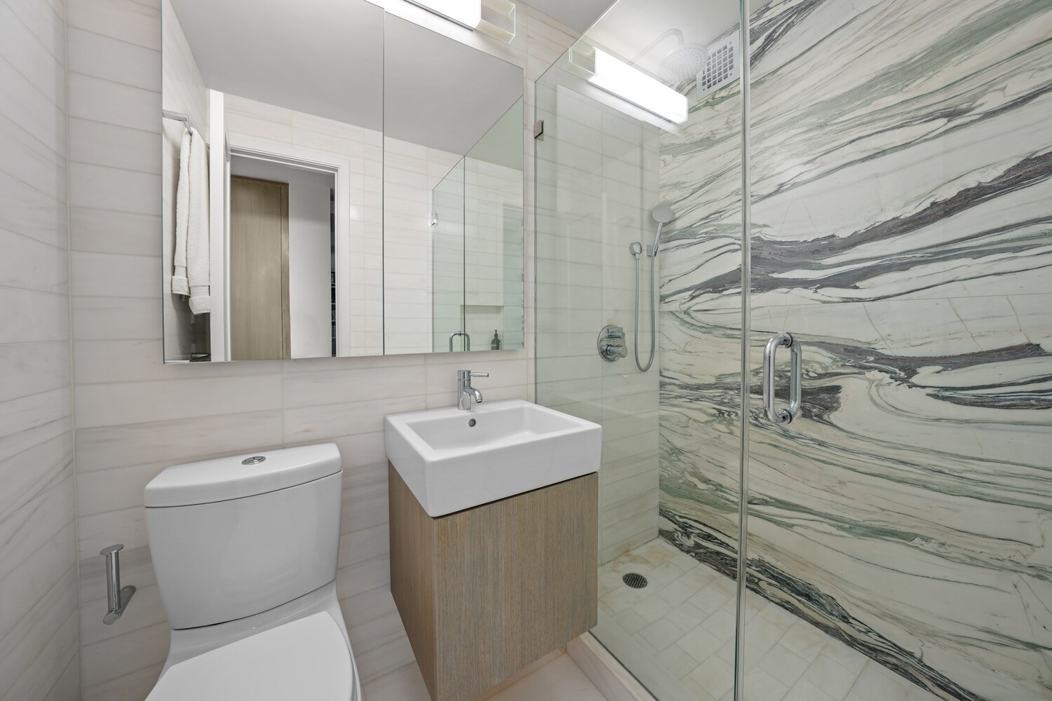 Both bedrooms are tranquil retreats, featuring electric blinds with solar and blackout shades, custom closets, and calming Park views. The expansive primary suite offers a spa-inspired en suite bath clad in solid Carrera marble walls, with Dornbracht and Duravit designer fixtures and a Zuma soaking tub with railhead shower plus two custom fitted closets including a very large walk-in. The generously proportioned secondary bedroom-equally refined-boasts its own designer bath clad in solid Carrera marble walls and accessorized with a walk-in shower and custom vanity.