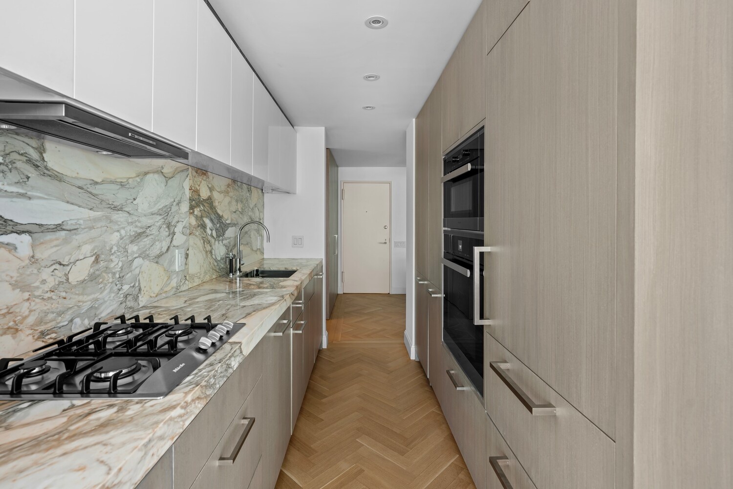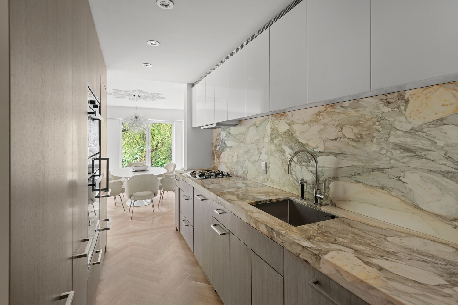 The chef's kitchen is a masterclass in both function and form, featuring Calacatta Borghini marble countertops and backsplash, premium appliances by Miele, Bosch, and Liebherr, custom cabinetry with integrated underlighting, an Asko washer/dryer discreetly built-in, and a large walk-in pantry designed for seamless everyday living.