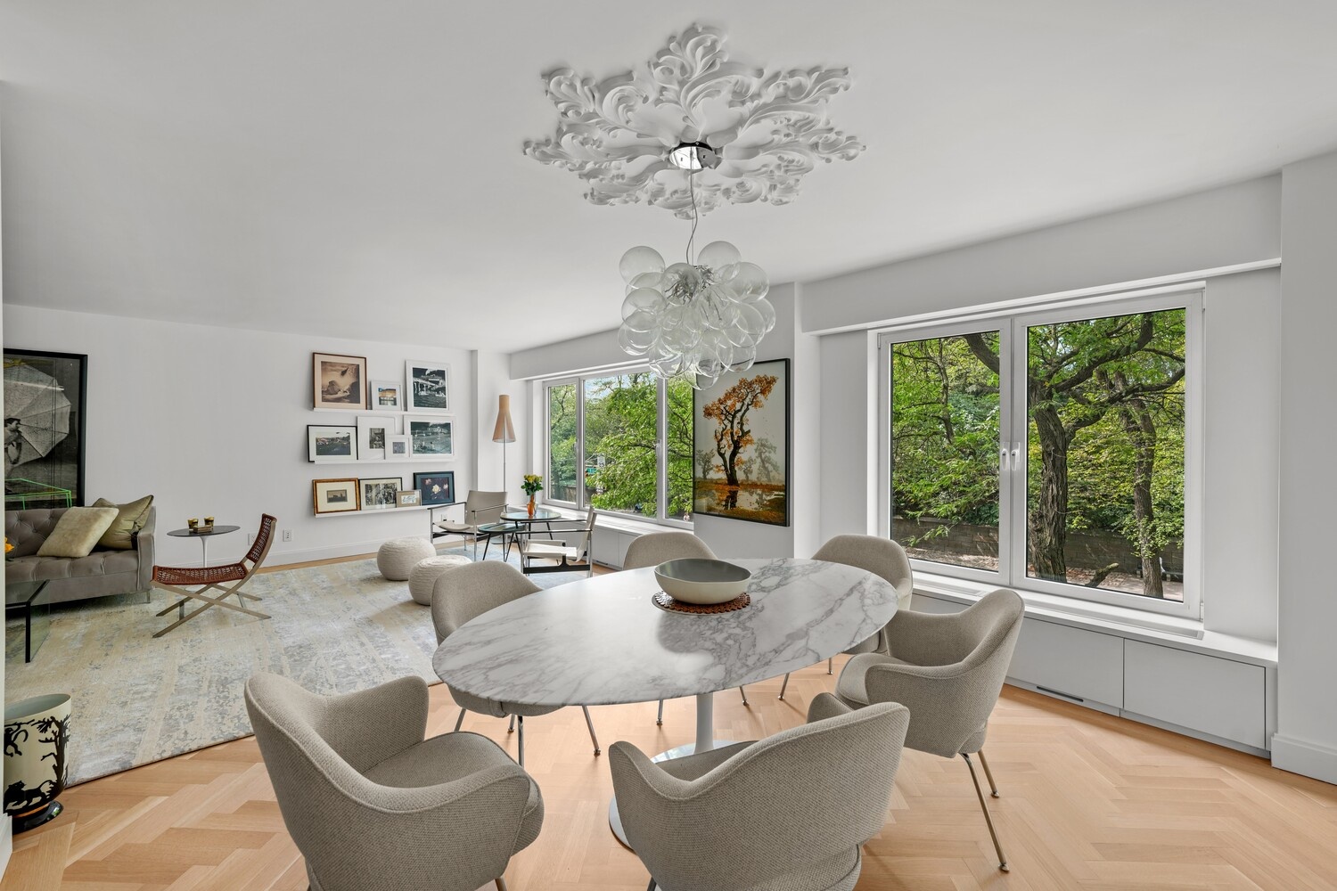 A rare offering on the Gold Coast of Fifth Avenue, this exquisitely reimagined two-bedroom, two-bathroom home at 1050 Fifth Avenue is a seamless fusion of refined modern living and timeless elegance-framed by uninterrupted Central Park views from every room. From the moment you arrive, this mint-condition residence captivates with its grand scale and curated design. A formal entry gallery adorned with bespoke built-ins leads into a luminous, oversized living and dining room, where floor-to-ceiling picture windows showcase the natural splendor of Central Park throughout the seasons. Every element has been thoughtfully elevated-from three-inch white oak herringbone flooring to custom lighting-delivering both style and substance.