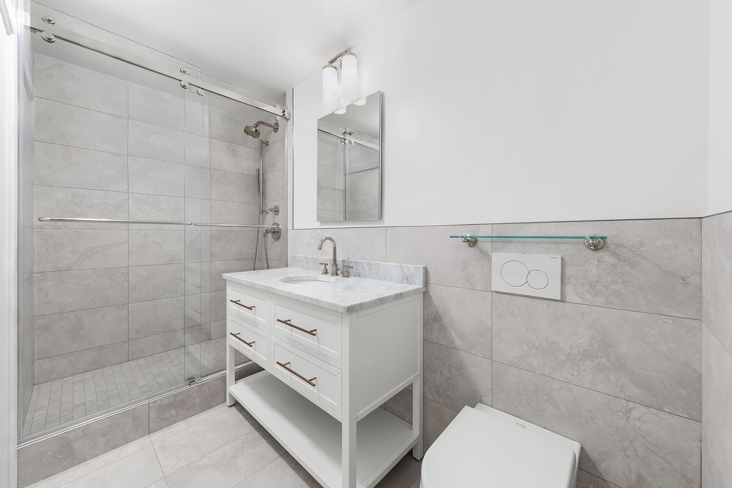 The sleek modern kitchen features new stainless steel appliances, custom cabinetry, white stone countertops, and a central island-excellent for cooking and entertaining. The spa-like bathroom offers generous space, complete with a marble vanity and a luxurious walk-in shower with custom sliding glass doors.