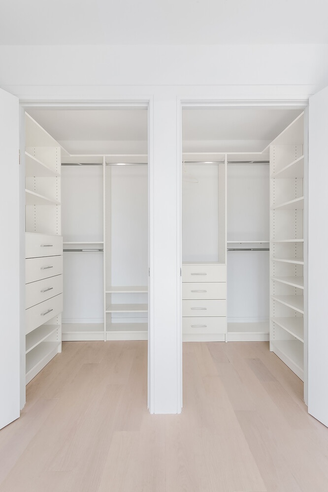 The spacious bedroom includes dual walk-in closets, thoughtfully customized for storage and organization. In addition to the bedroom walk-ins, the apartment offers four extra closets, including a coat closet, linen closet, utility closet, and an additional storage closet.