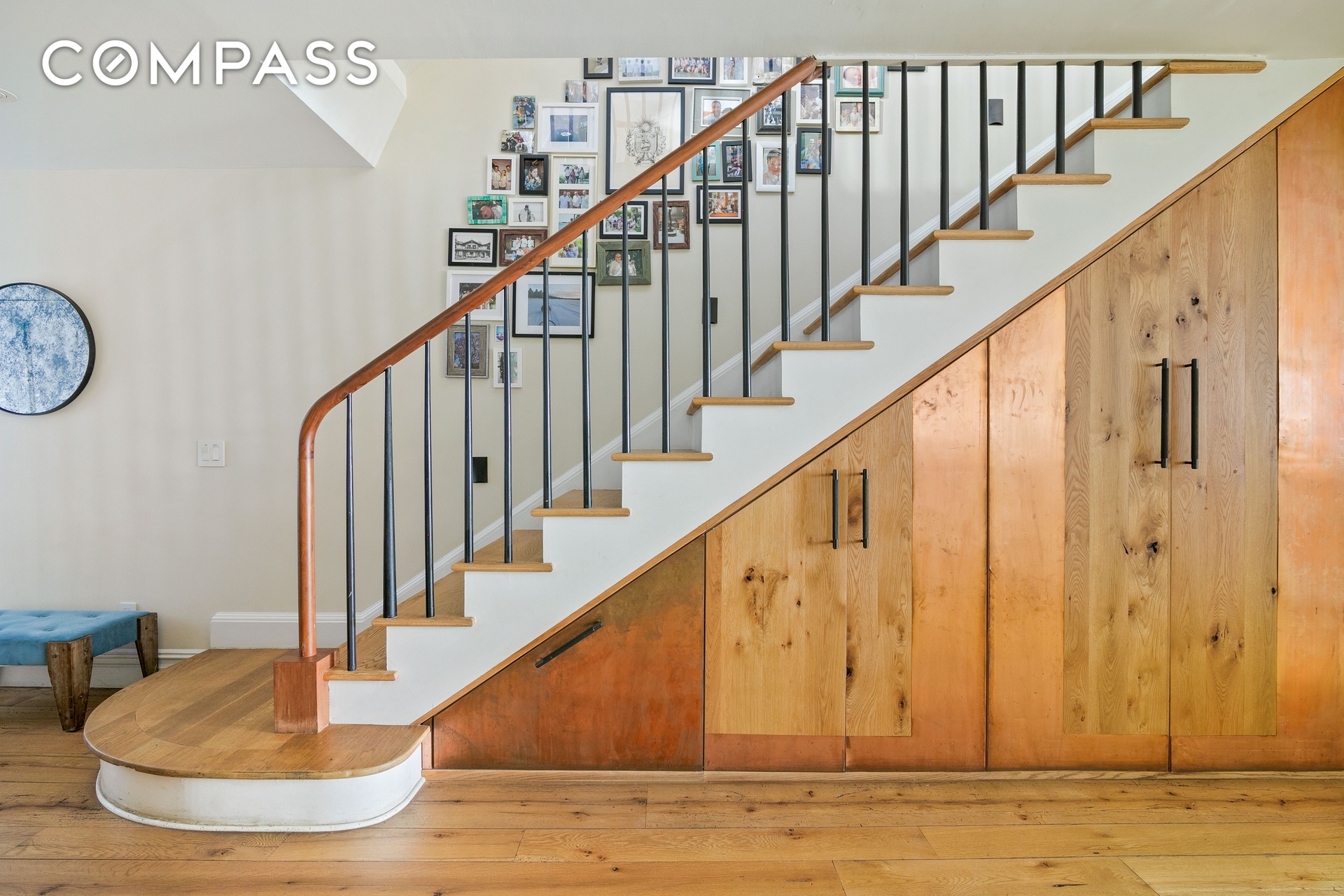 PARLOR FLOOR: The gracious parlor floor is accessed by ascending the stoop stairway and entering through the beautifully preserved double doors. A large, loft-like space and fireplace frame stunning vistas to the North and South overlooking the garden. There is also a powder room on this level and a second stairway that connects the parlor to the Garden floor below.