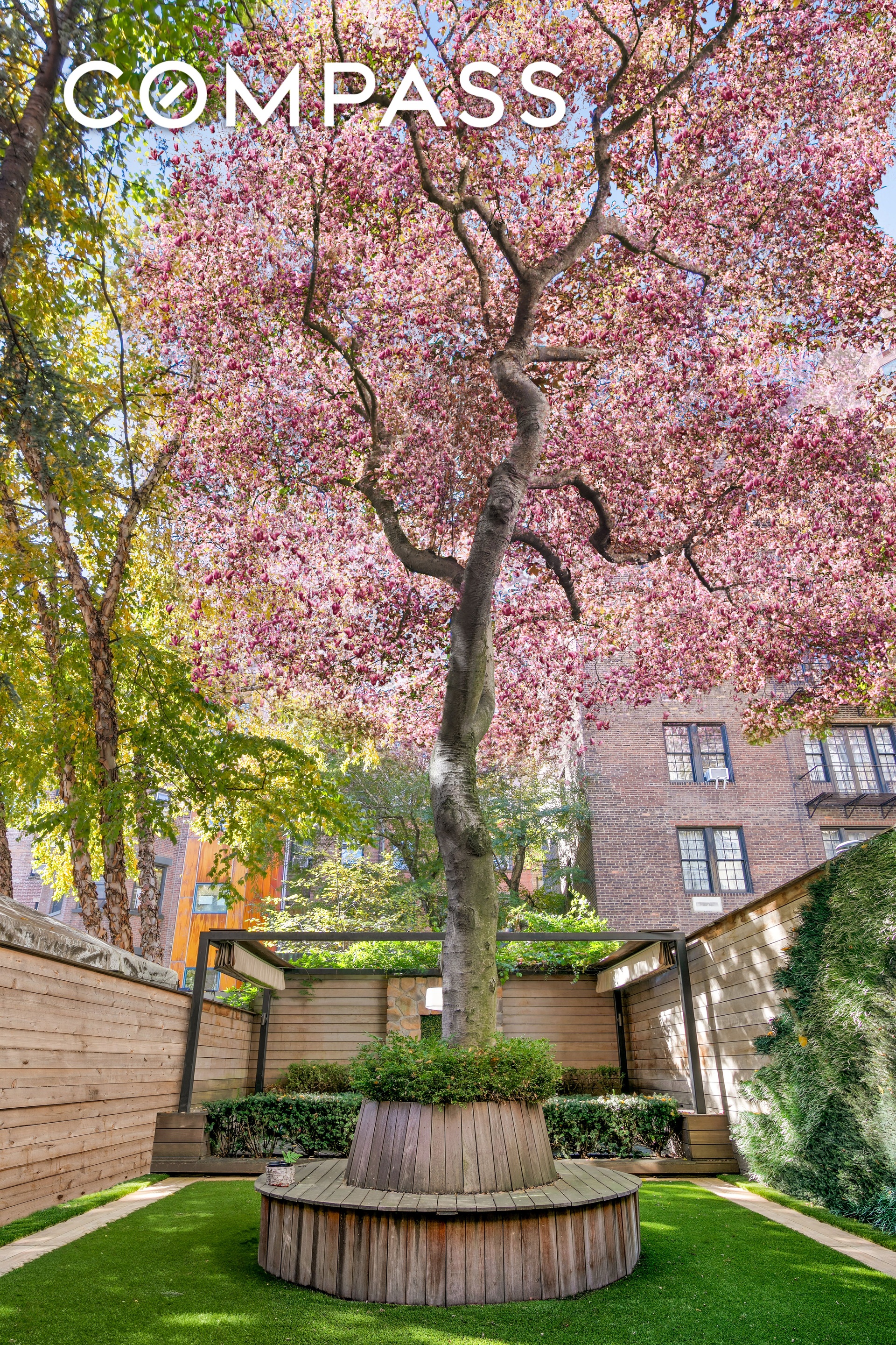 GARDEN FLOOR: Enter the garden floor under a superbly restored stoop through a set-back fenced in garden. This floor contains an additional bedroom, full bath and an impressively scaled custom crafted kitchen with Sie-matic cabinetry, Wolf, Miele and Sub-Zero appliances, stone counters and marble back splashes as well as an inviting counter seating area. The kitchen adjoins the wonderful great room with its soaring double-height ceilings and dramatic wall of windows overlooking the south-facing landscaped garden shaded by Greenwich Village’s most prized Magnolia tree and a mature evergreen which provide year-round privacy in addition to their beautiful greenery. This floor opens onto a large south-facing garden in this highly desirable landscaped townhouse block.