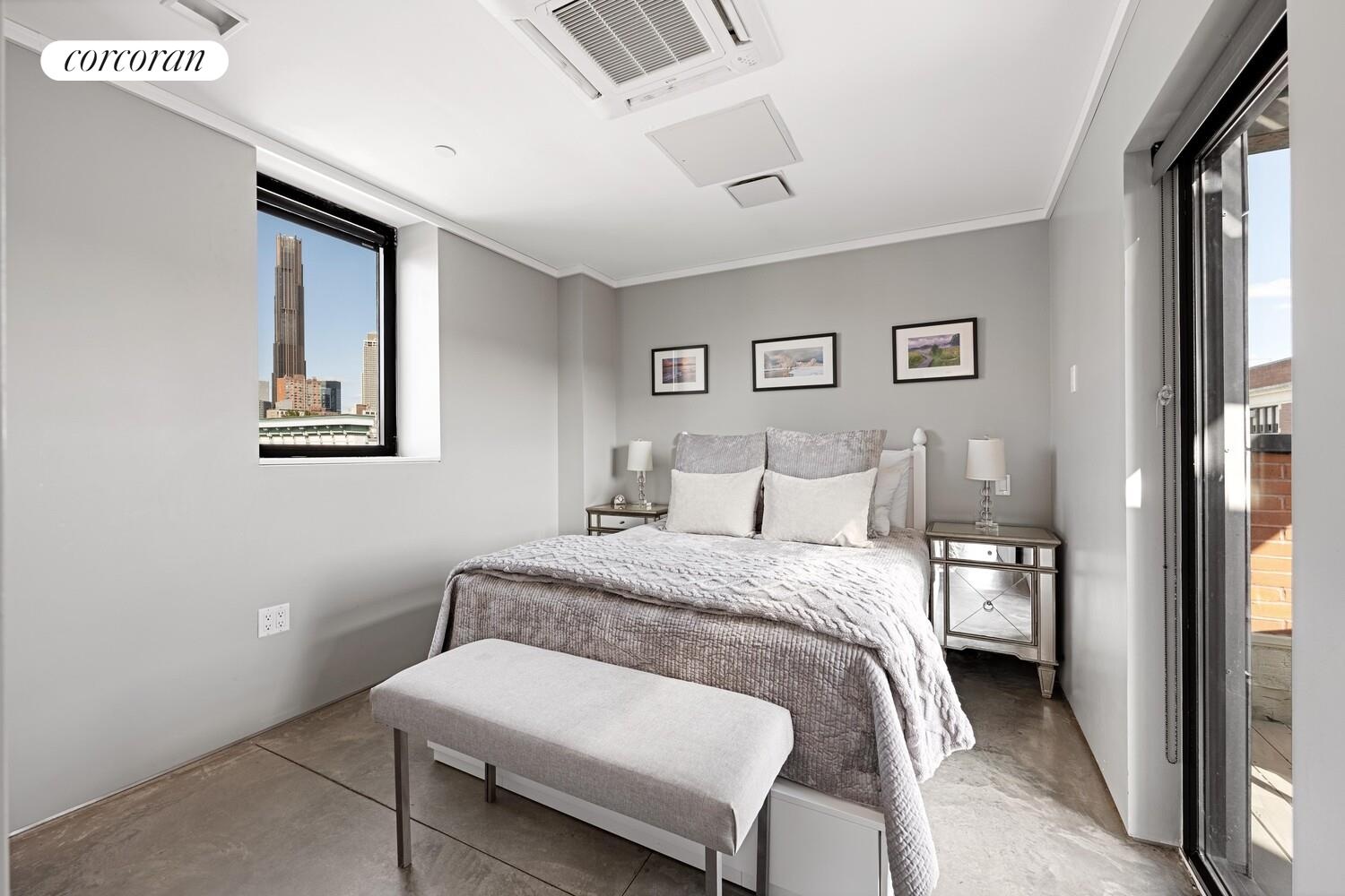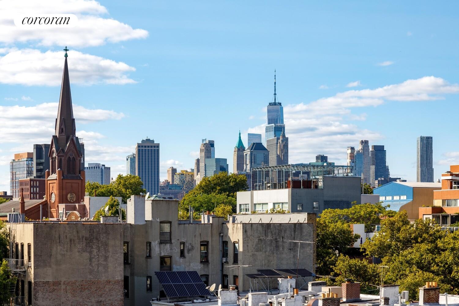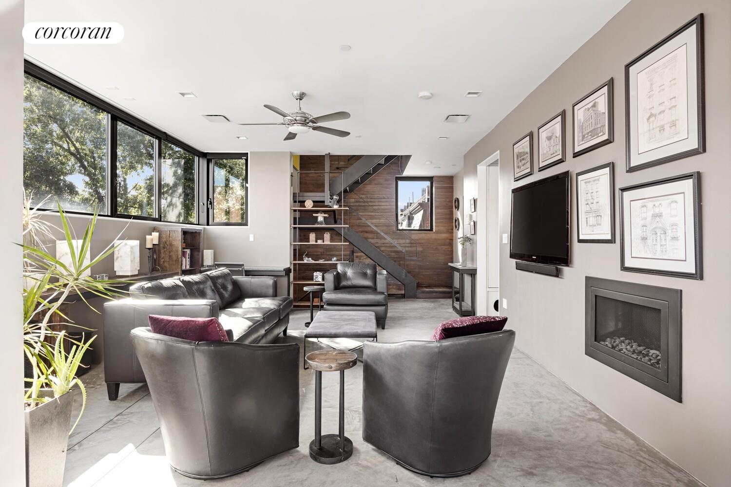 Enter the residential triplex through a private entrance on Warren St. and take the elevator up to a five-bedroom triplex that lives like a townhouse in the sky. Enjoy a great room that spans the entire 4th floor and includes a chef's kitchen with a walkout to a terrace. Enjoy skyline views, a suite of Thermador professional appliances, and white quartzite countertops including a large dining island. Poured concrete floors, an ethanol fireplace, a steel and wood staircase, and aged timber walls imbue the space with a warm industrial atmosphere reflective of the neighborhood's timeless historic appeal. The top floor includes 3 bedrooms, a full bath, a large walk-in closet or home office, laundry, and a walkout to a magnificent terrace with striking views of the Brooklyn skyline. Head back down to the third floor which has been envisioned as a full floor primary suite with a separate home office, but also works great as a nanny or in-law suite, and includes a kitchen and its own laundry. With a minimum of 5 bedrooms and 3 full baths, your options are many. The indoor garage, conveniently accessible from the residential vestibule, offers the ability to add a lift for a 2nd car.