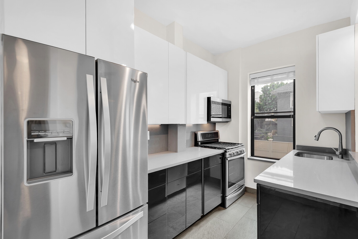 The modern kitchen is equipped with stainless steel appliances, high-gloss cabinetry, and quartz countertops. The renovated bathroom includes a glass-enclosed shower and contemporary finishes. Both bedrooms are generously sized, providing comfort and versatility for various lifestyle needs.
