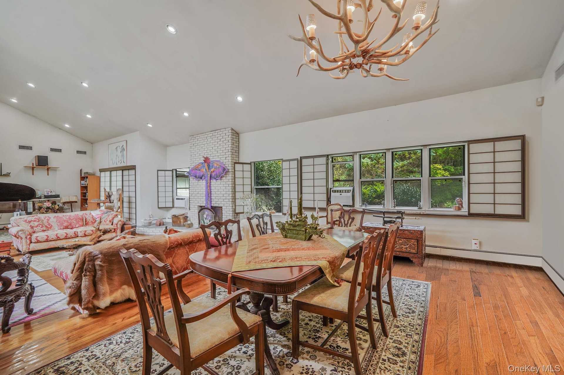 Welcome to this exceptional Fort Salonga residence offering over 4,000 sq ft of living space on a private, wooded acre. This 4-bedroom (with option for a 5th) home showcases an open-concept dining room, living room, and elegant sitting room accented by a piano, all enhanced by soaring ceilings, skylights, and walls of windows that fill the home with natural light. The primary suite boasts a walk-in closet, jacuzzi tub, and glass shower. Enjoy year-round relaxation in the heated conservatory and unwind in the unique two-level sauna. Additional highlights include hardwood and tile floors, stainless steel appliances, custom stained-glass entry doors, a 2-car garage with heated storage, stone terraces, and a basement. Modern comforts include 3 heating zones, dimmable lighting, whole house alarm system, and a whole-house Kohler generator. With over an acre of privacy, handmade stone walls, a dog run with barn, and ample parking, this property is a rare North Shore retreat.