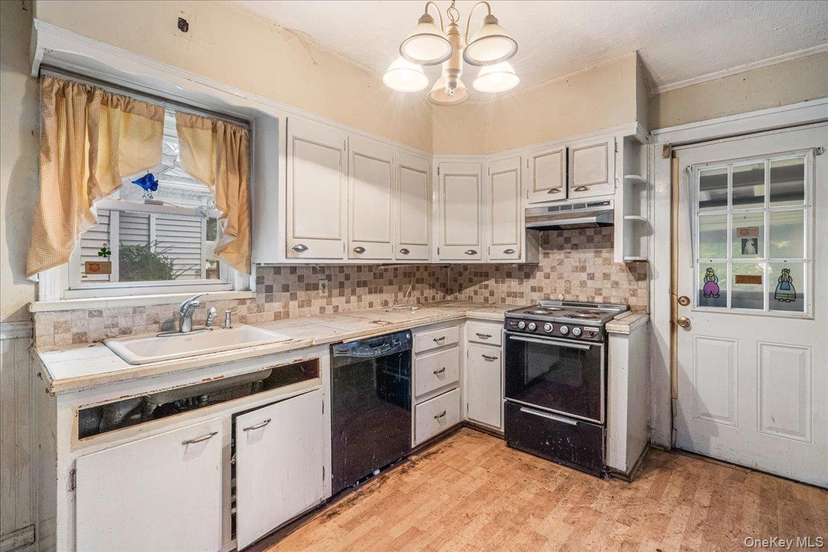 - Kitchen with backsplash, black appliances, white cabinetry, and light wood finished floors