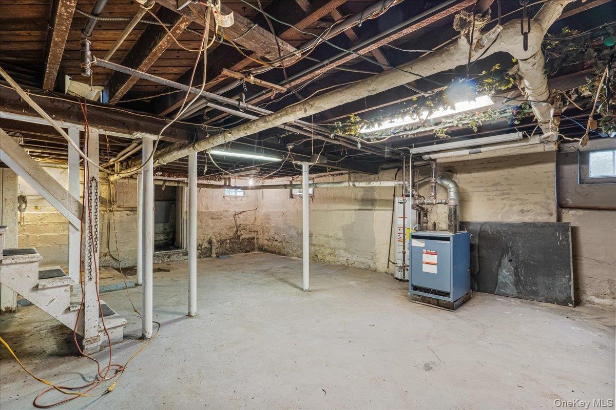 - Below grade area featuring gas water heater, stairway, and a heating unit