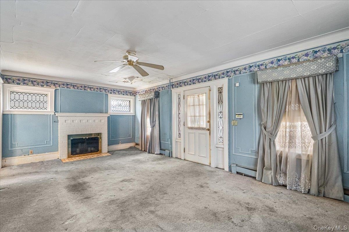 - Unfurnished living room with a ceiling fan, carpet floors, and a fireplace