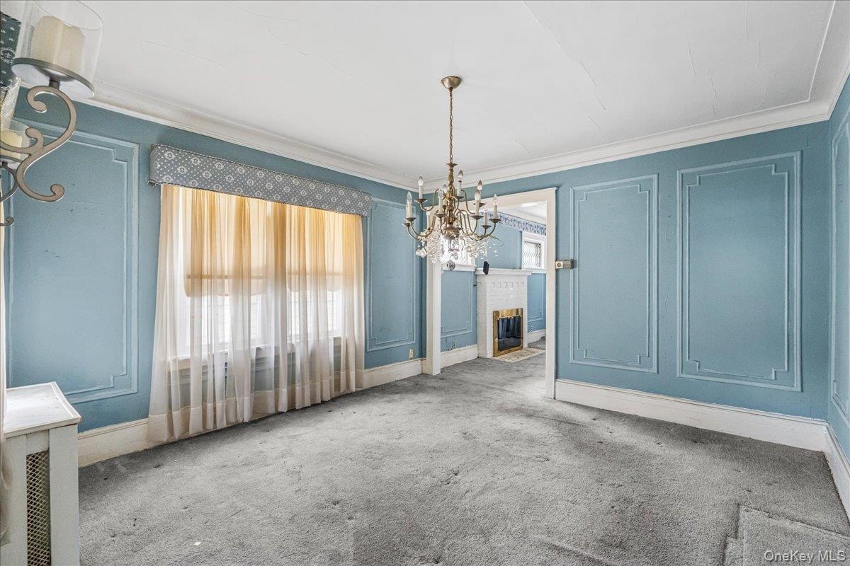 - Unfurnished dining area with ornamental molding, carpet, a chandelier, a brick fireplace, and a decorative wall