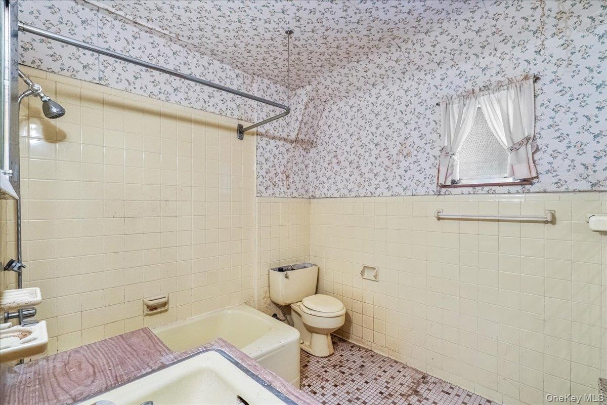 - Bathroom featuring tub / shower combination, tile walls, tile patterned flooring, wainscoting, and wallpapered walls