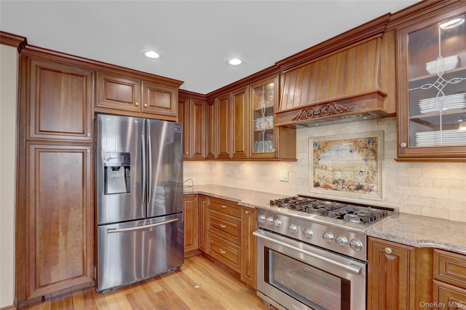 - Kitchen with appliances with stainless steel finishes, brown cabinetry, light stone counters, light wood-style flooring, and recessed lighting