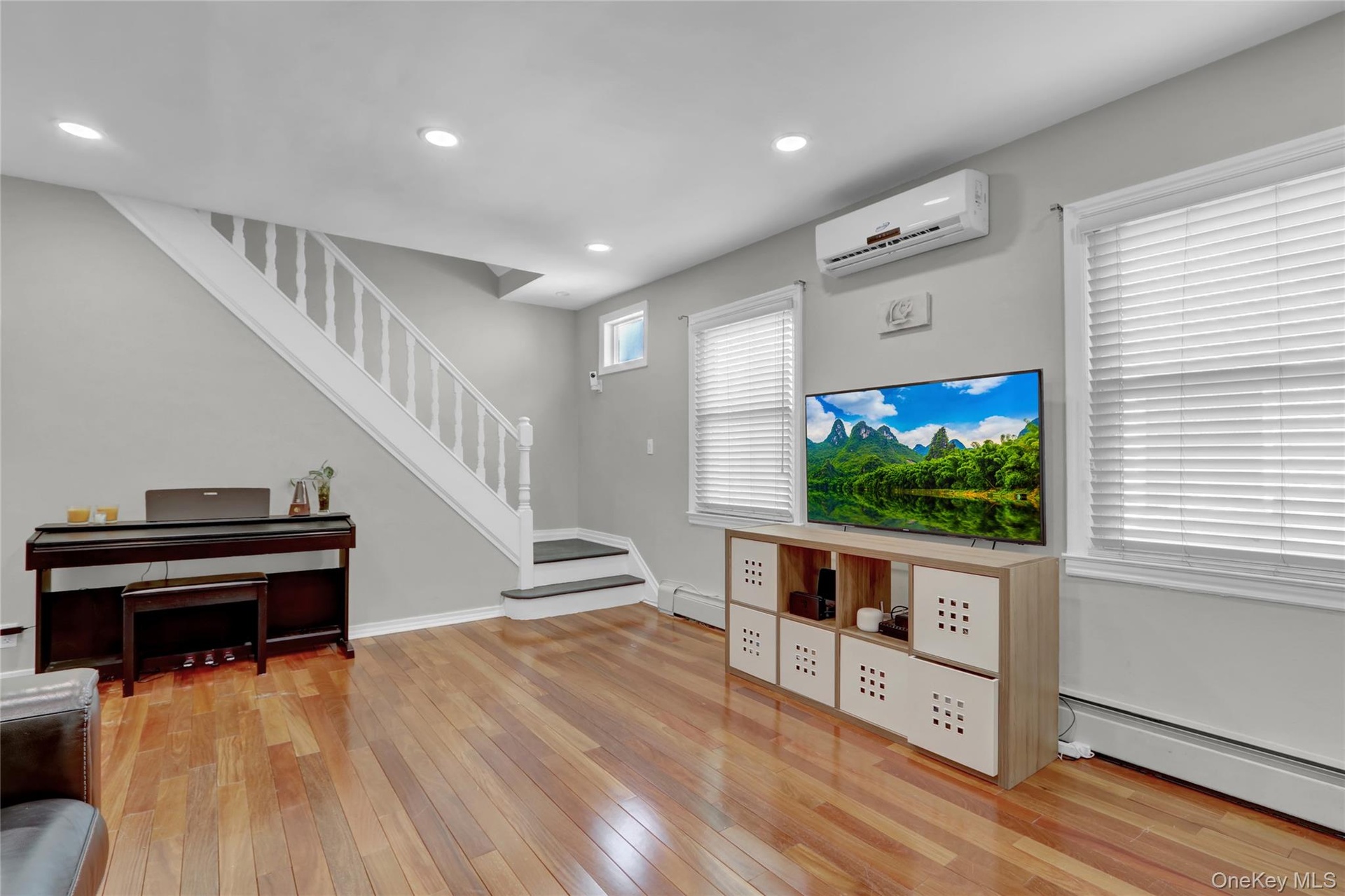 - Living room featuring light wood-style floors, baseboard heating, a wall unit AC, recessed lighting, and a baseboard heating unit