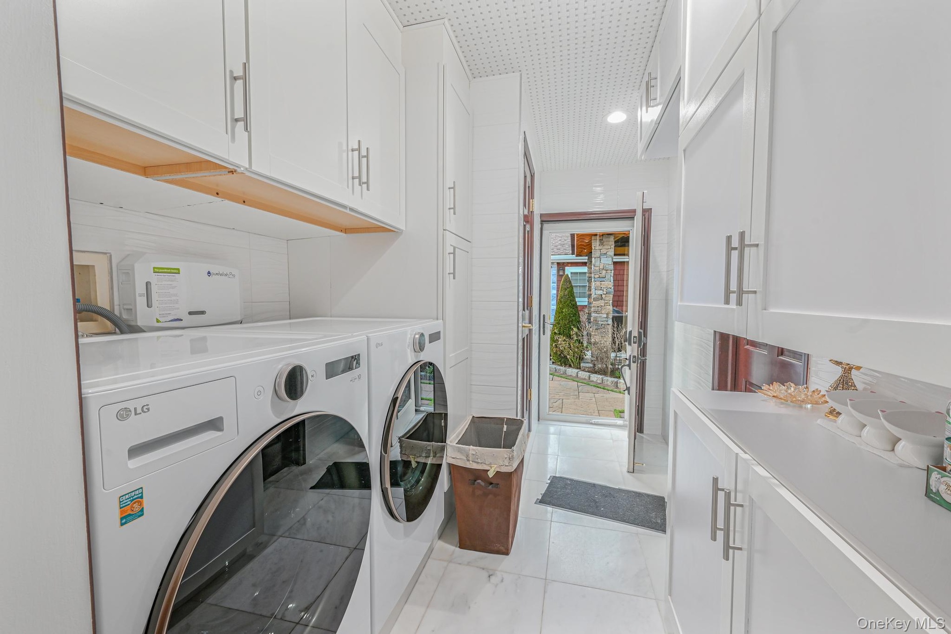 - Laundry room with cabinet space, washing machine and dryer, and light tile patterned floors