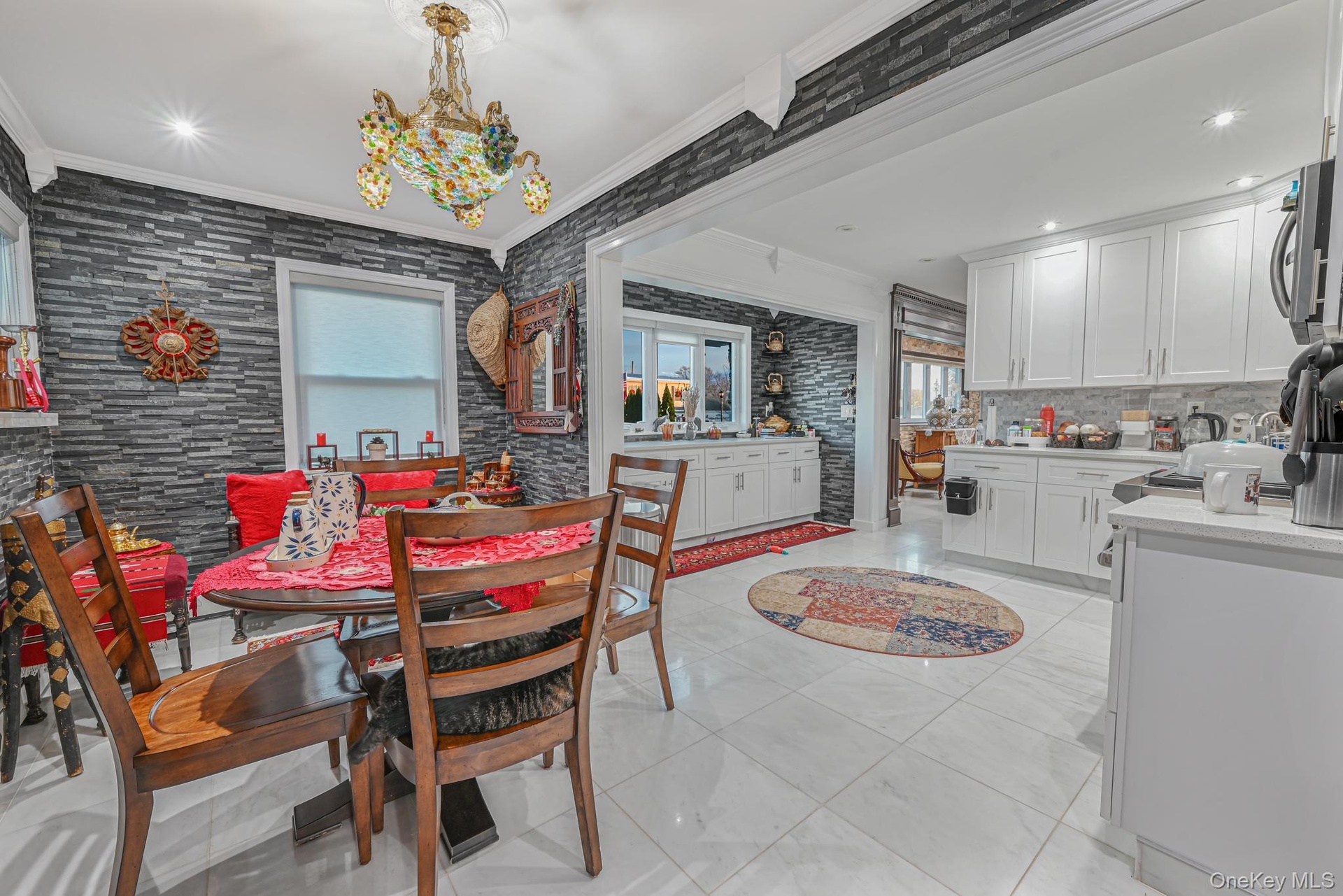 - Dining room with ornamental molding, plenty of natural light, recessed lighting, light tile patterned floors, and a chandelier