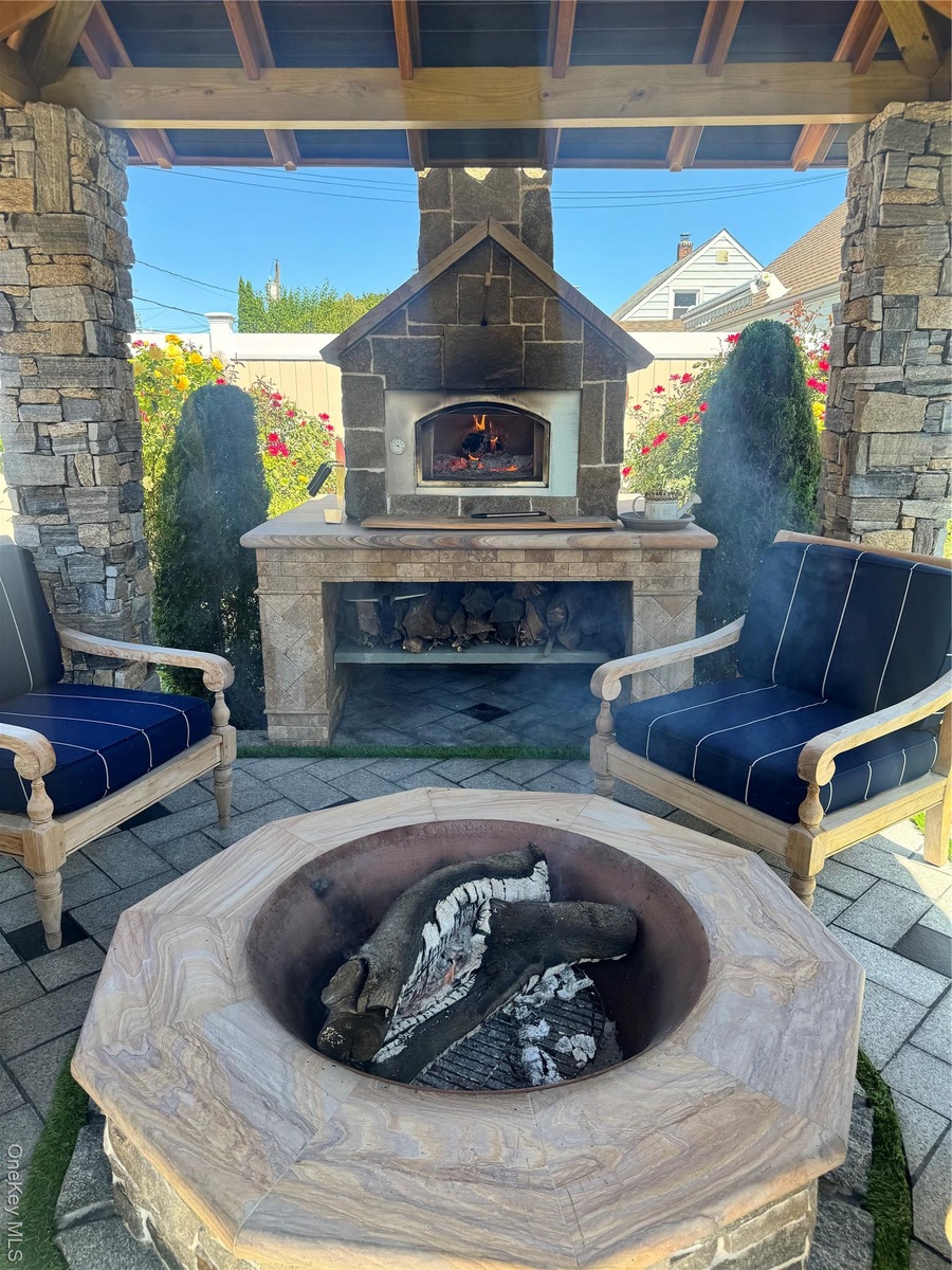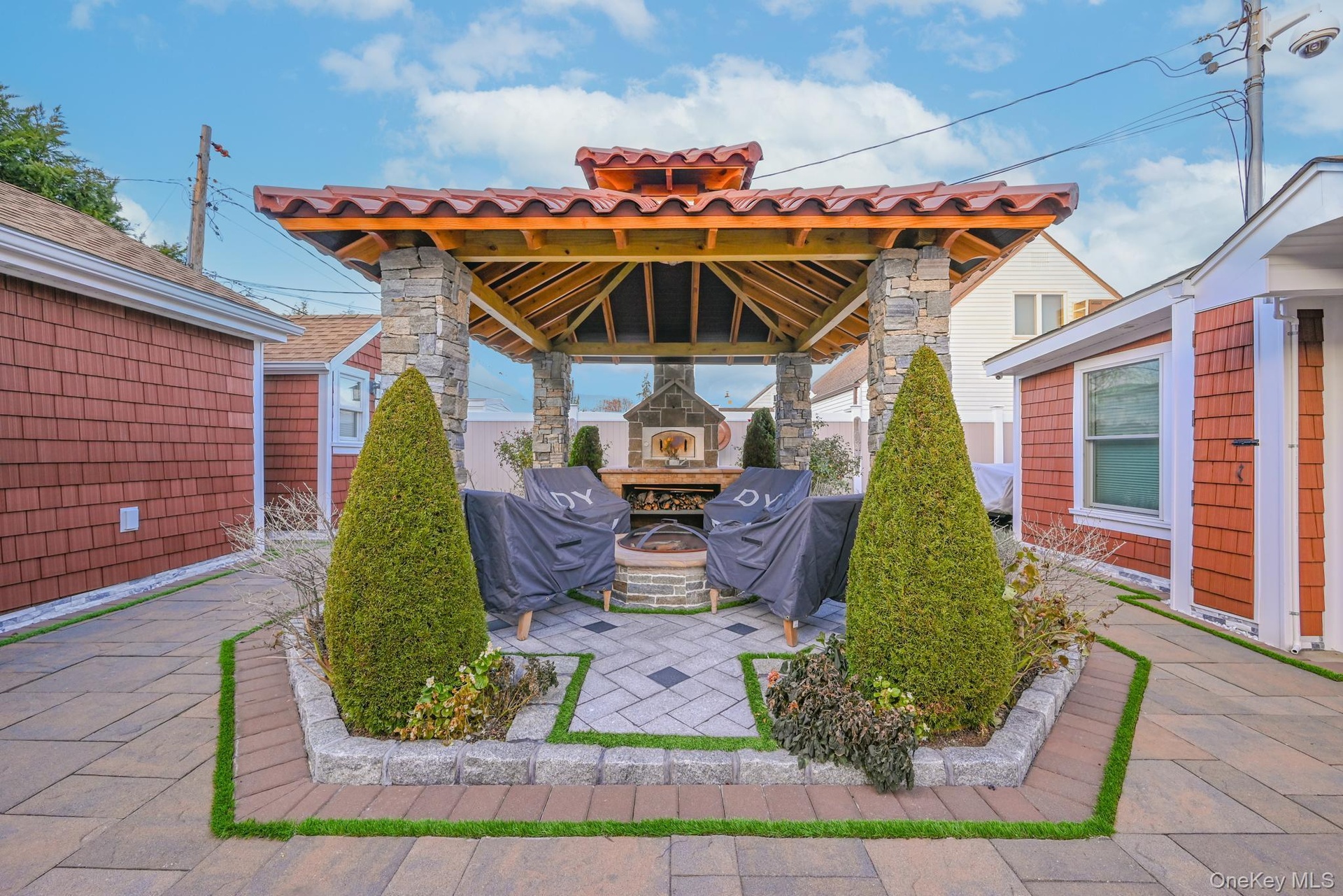- View of patio featuring a gazebo, an outdoor stone fireplace, and area for grilling