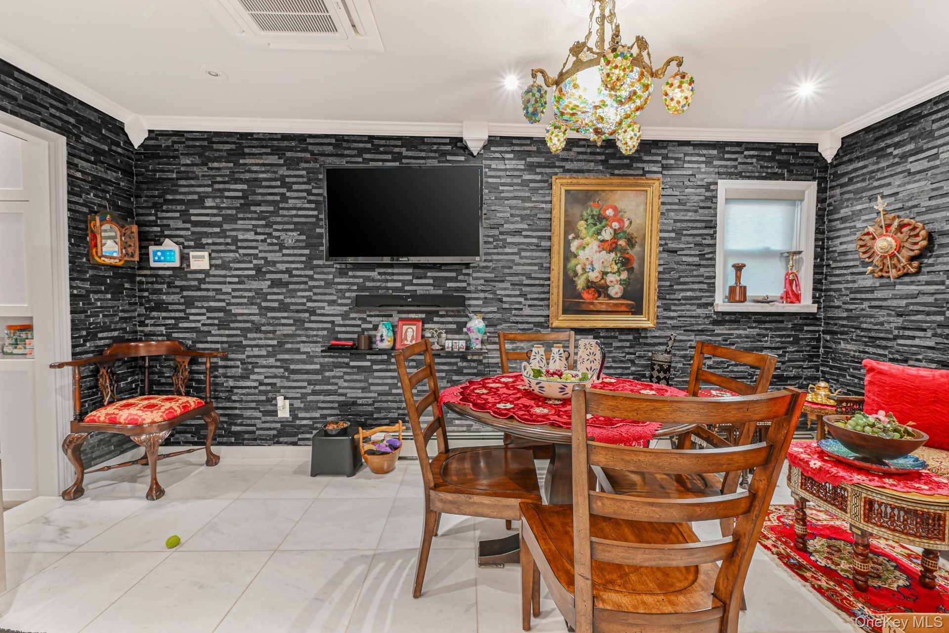 - Dining area featuring ornamental molding, tile patterned flooring, and recessed lighting