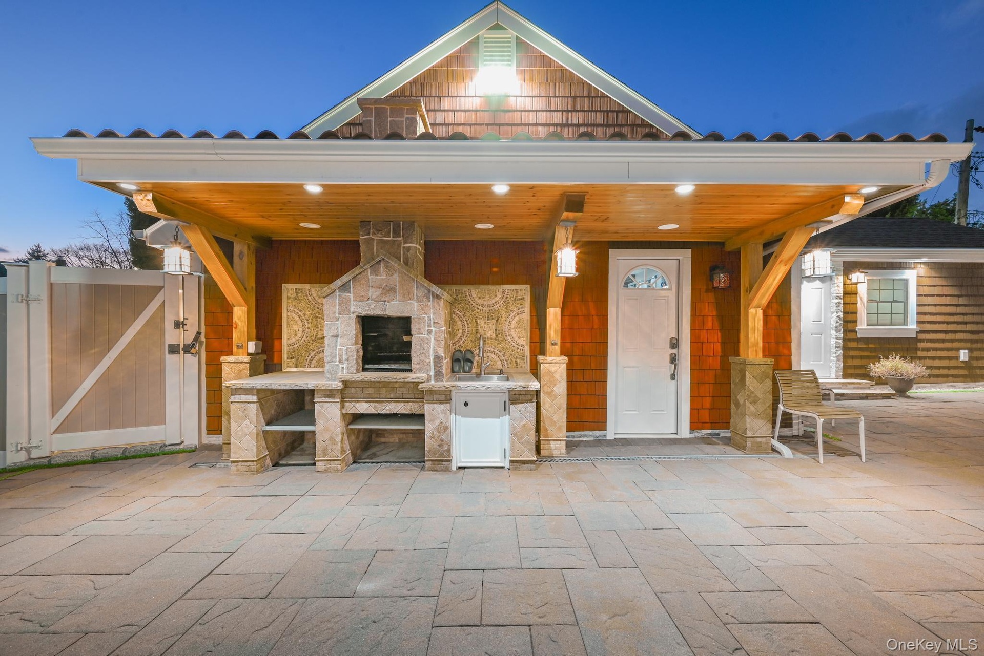 - View of patio / terrace with an outdoor stone fireplace, a gate, and outdoor dining space