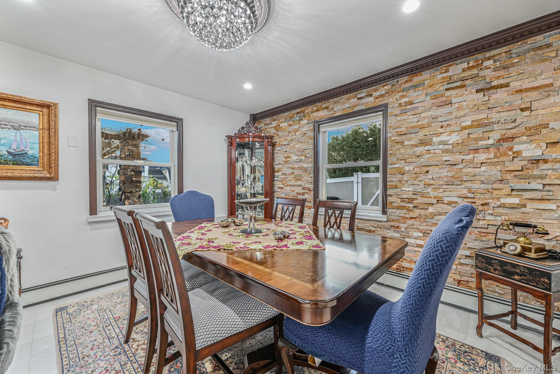 - Dining area featuring a baseboard heating unit, a chandelier, recessed lighting, and a baseboard radiator