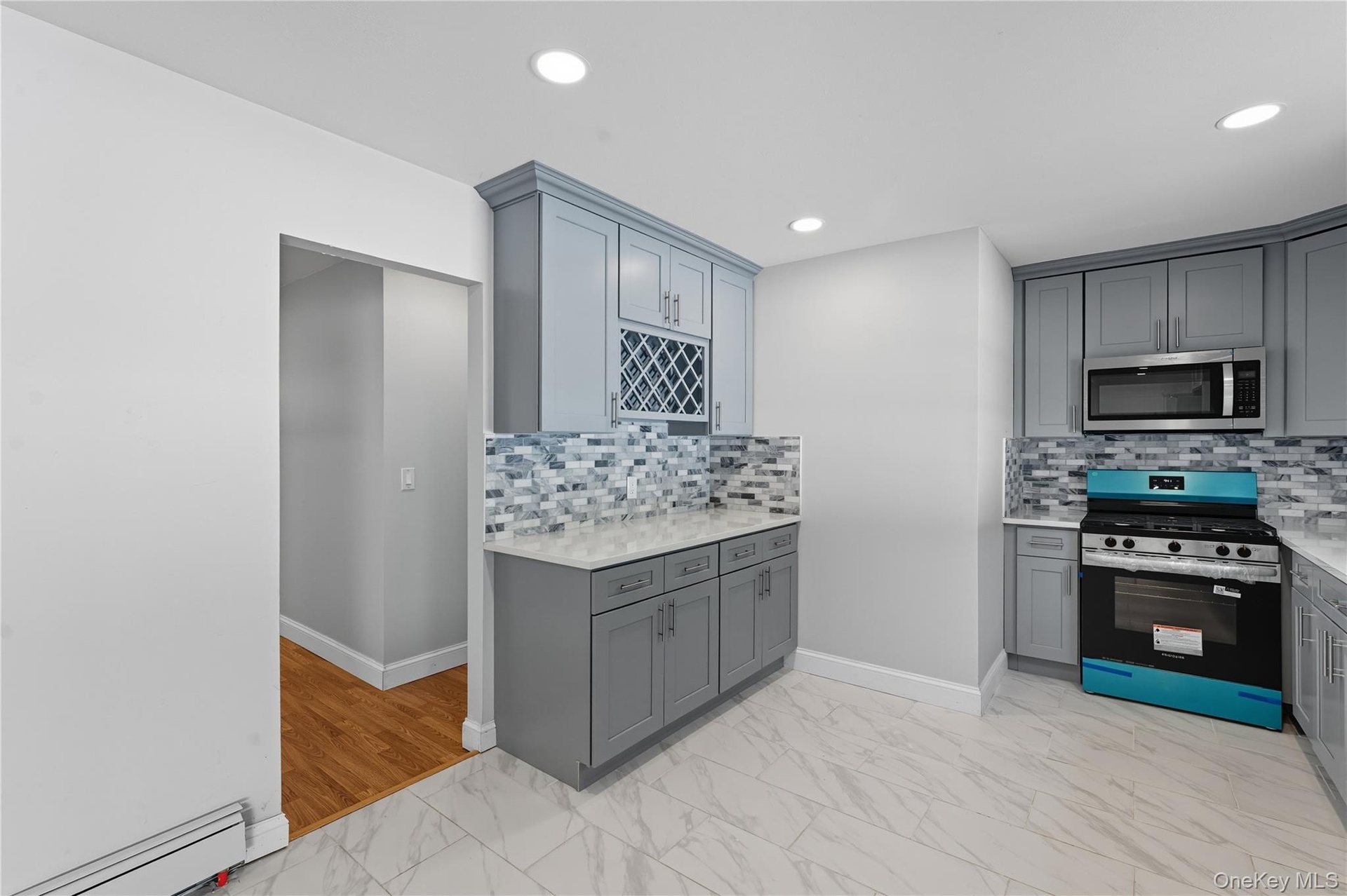 - Kitchen featuring stainless steel appliances, gray cabinetry, light marble finish flooring, a baseboard radiator, and backsplash