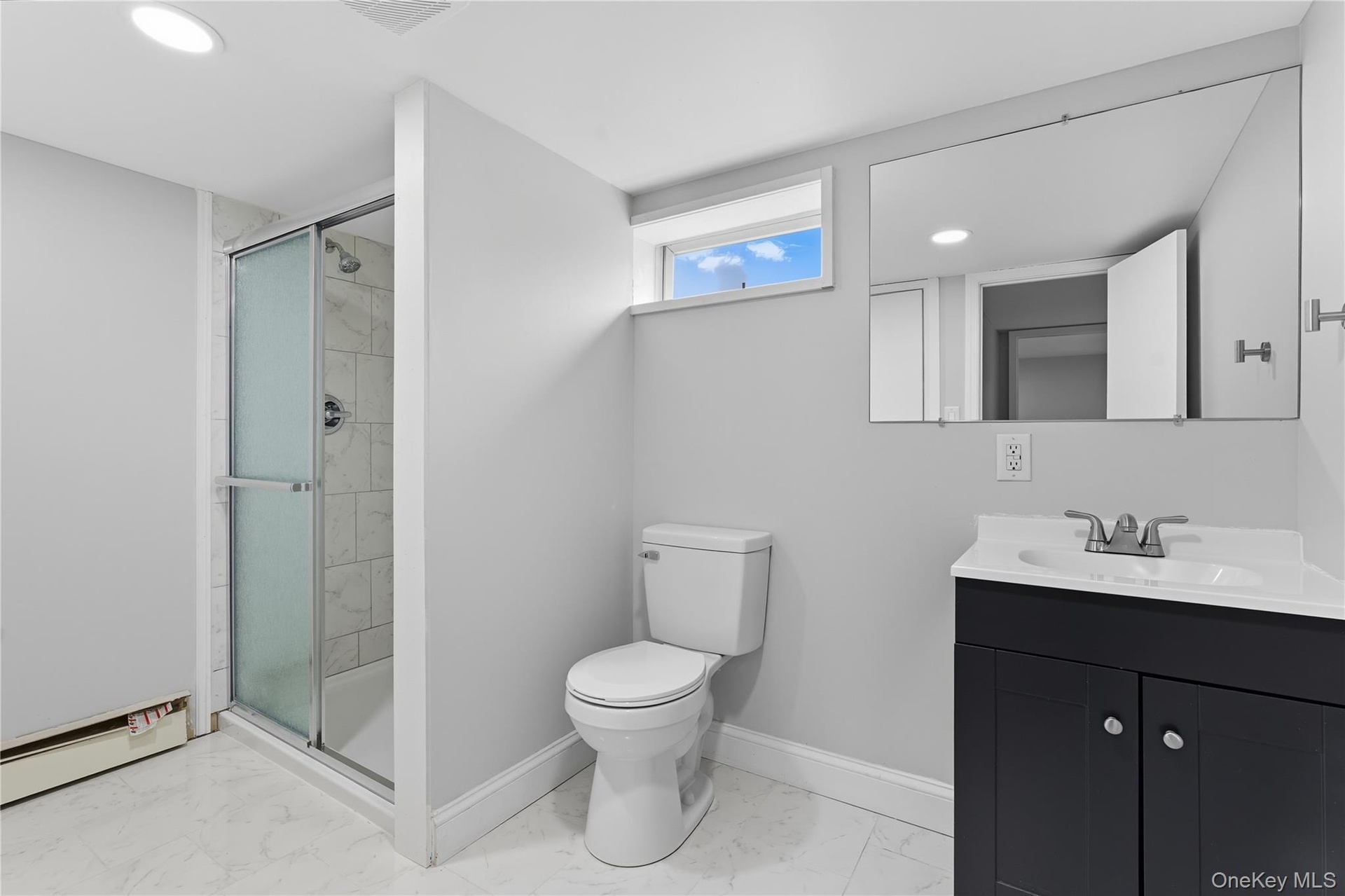 - Full bath with vanity, a shower stall, light marble finish flooring, recessed lighting, and baseboard heating