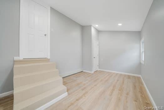 - Spare room featuring a baseboard radiator, recessed lighting, and light wood-style floors