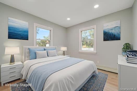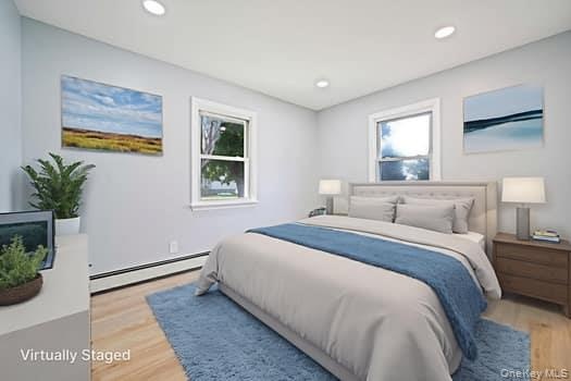 - Bedroom with baseboard heating, light wood-style flooring, and recessed lighting