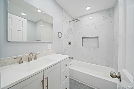 - Bathroom featuring shower / washtub combination, vanity, recessed lighting, and dark tile patterned floors