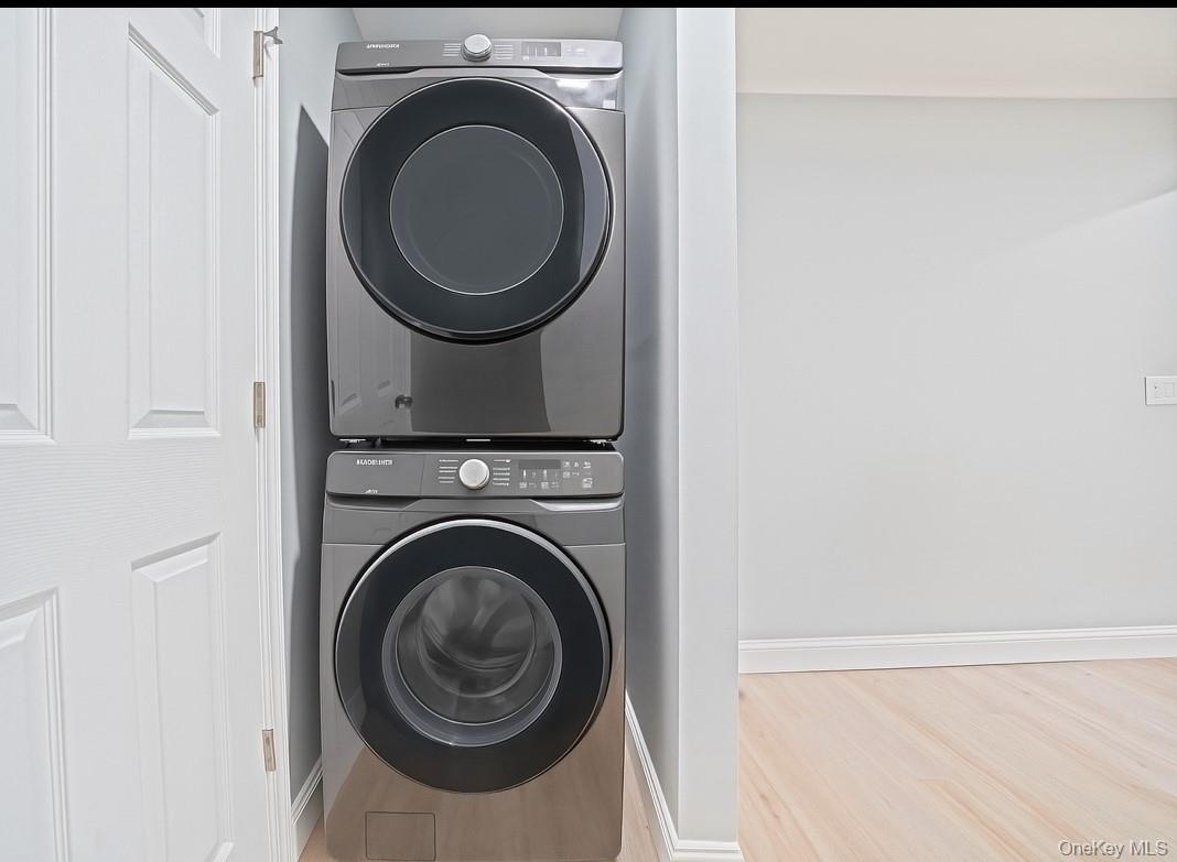 - Washroom featuring light wood finished floors and stacked washer / dryer