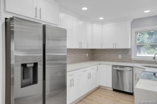 - Kitchen featuring appliances with stainless steel finishes, white cabinetry, light wood-style floors, tasteful backsplash, and recessed lighting