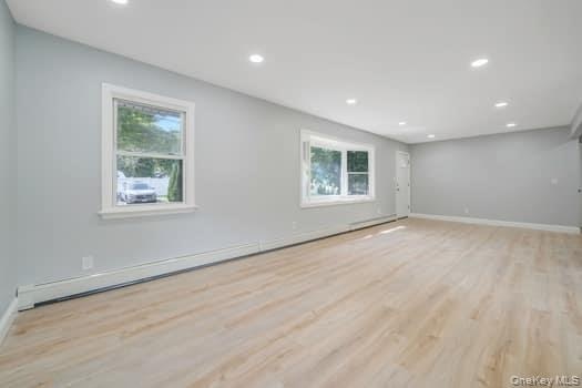 - Empty room with baseboard heating, light wood-style flooring, and recessed lighting