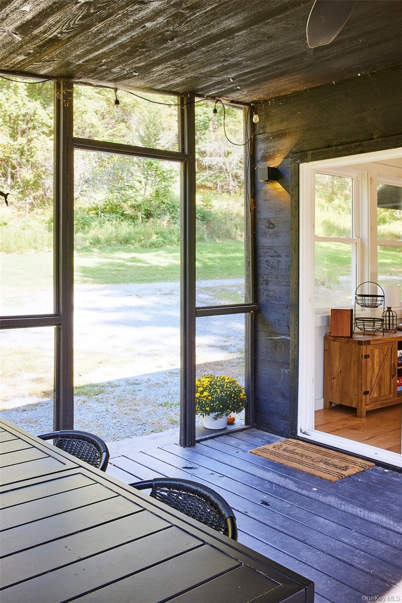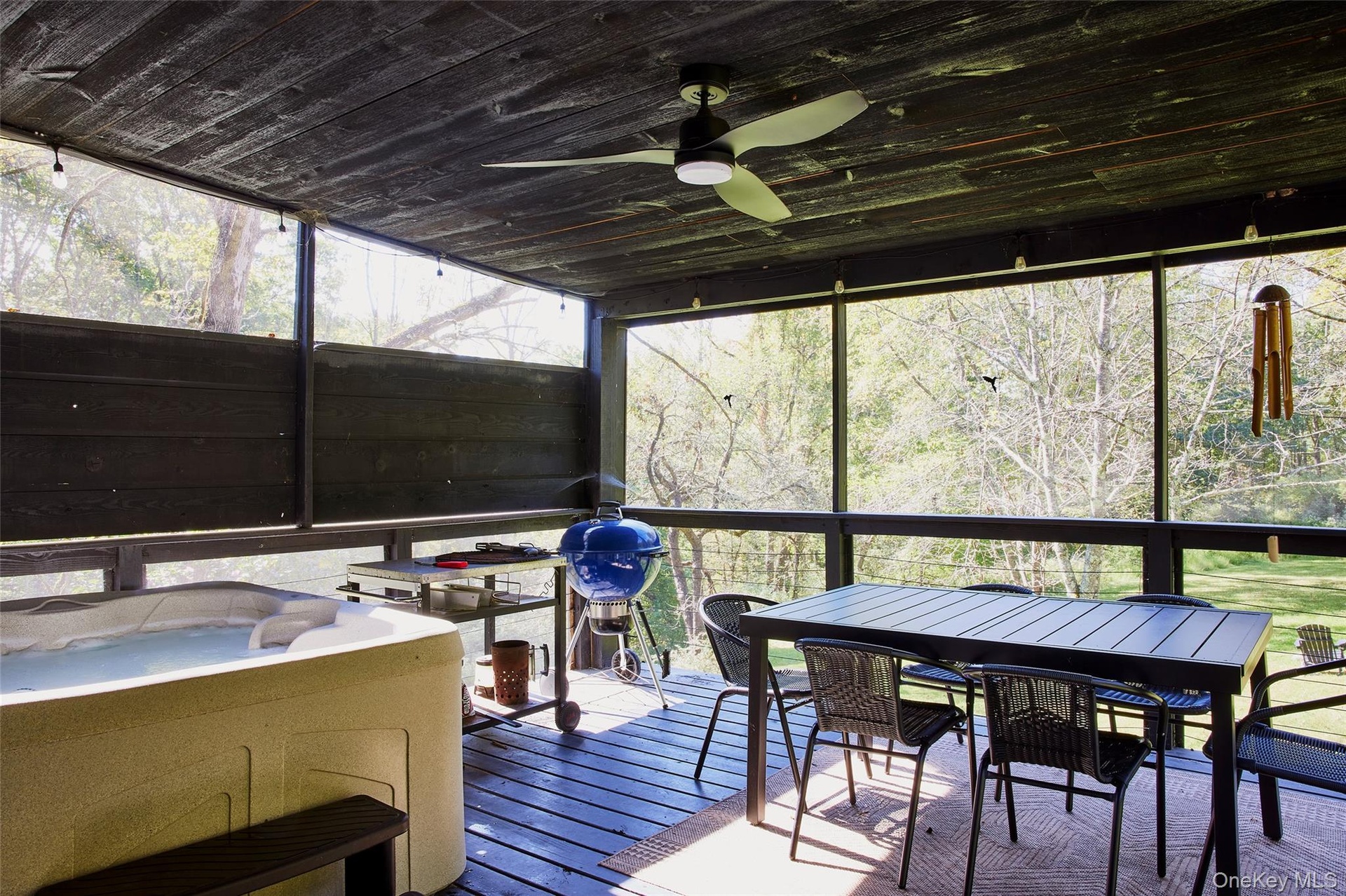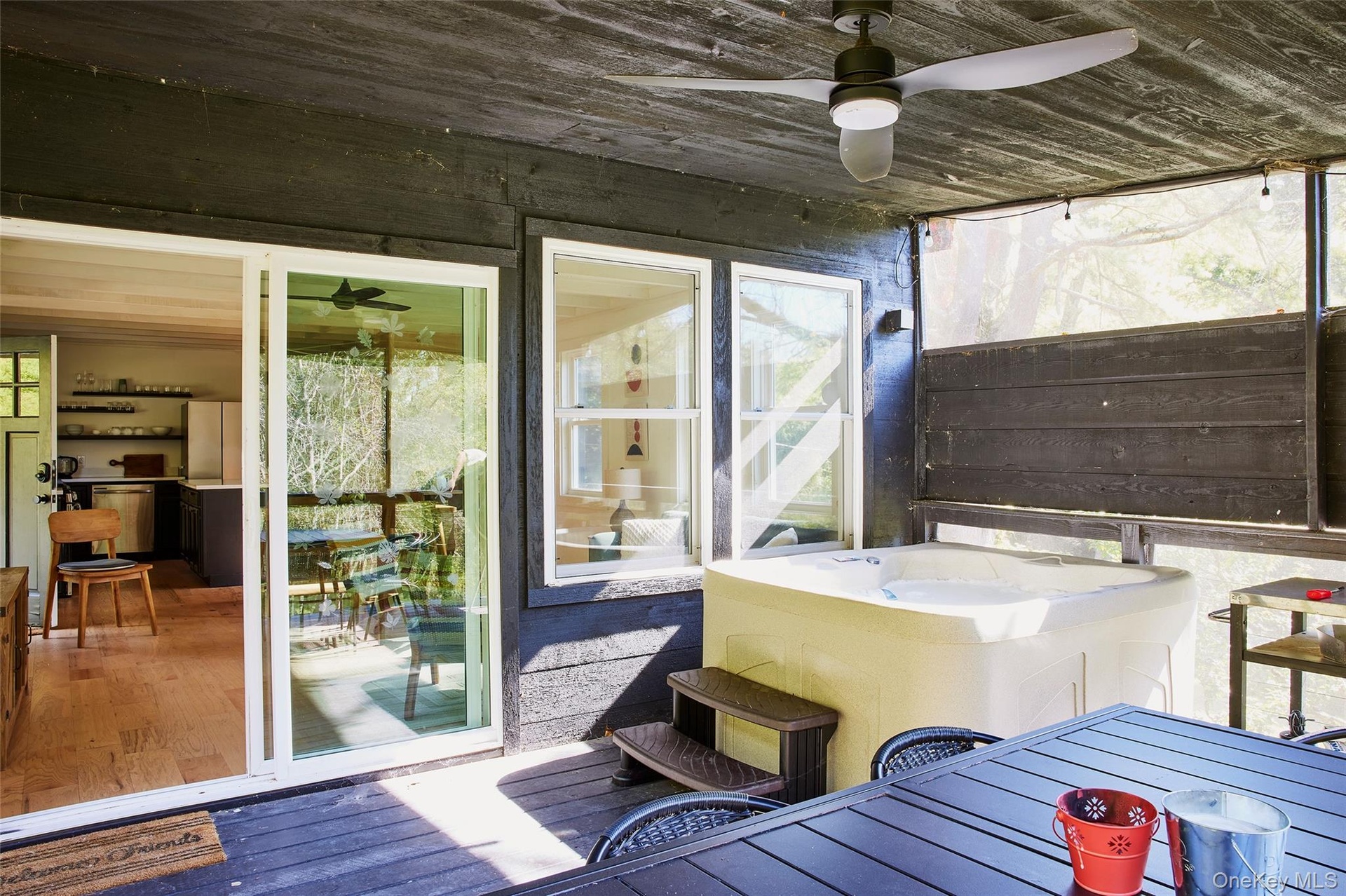 - Sunroom with outdoor dining space, ceiling fan, a deck, and a hot tub