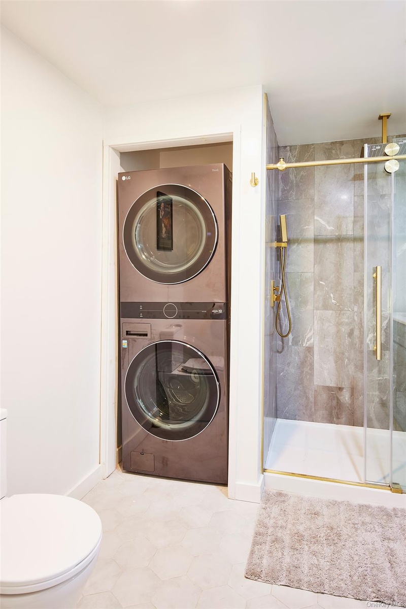 - Bathroom featuring a shower stall and estacked washer and dryer