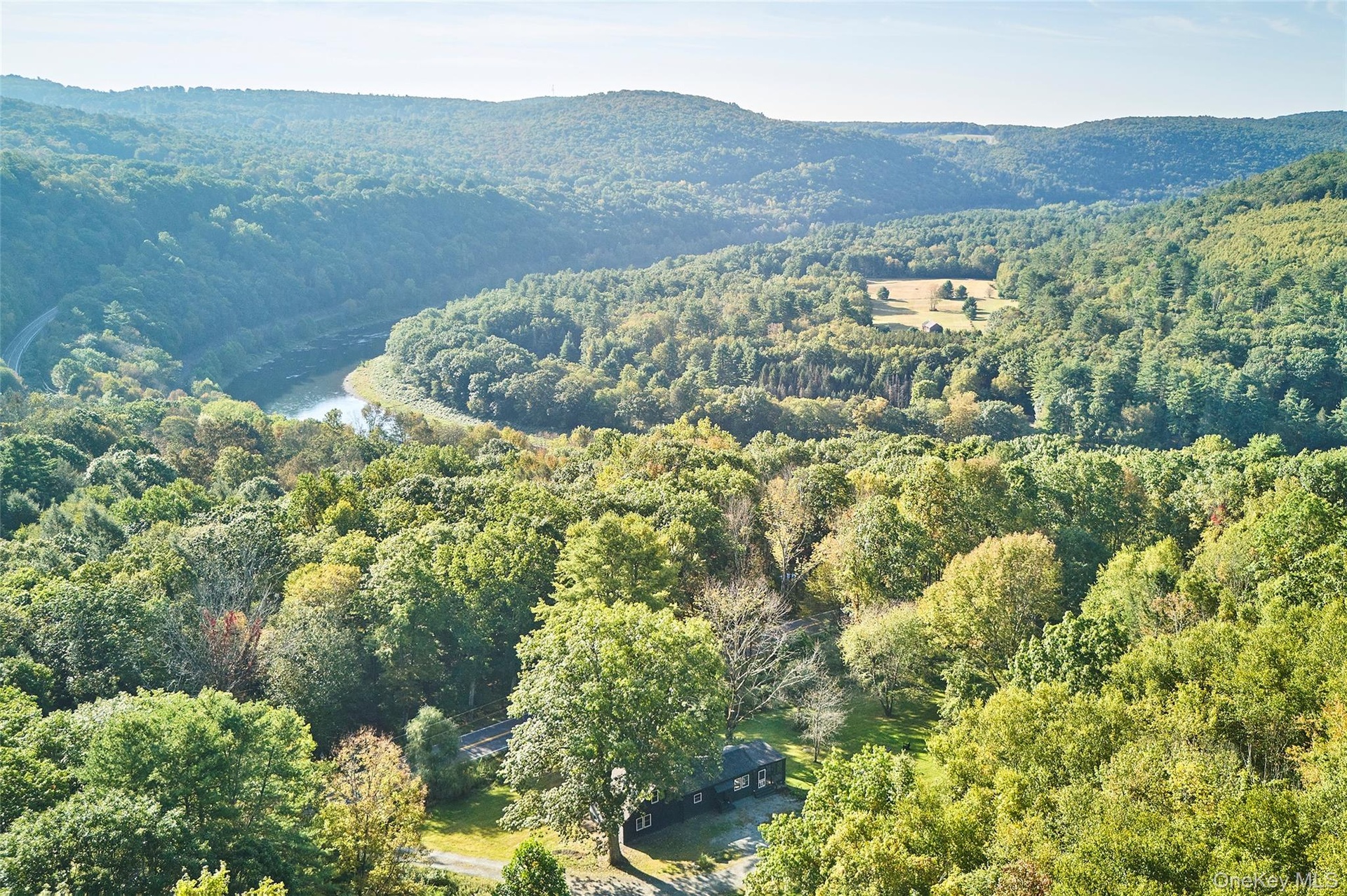 - Aerial view of property and surrounding area with a forest and a water and mountain view