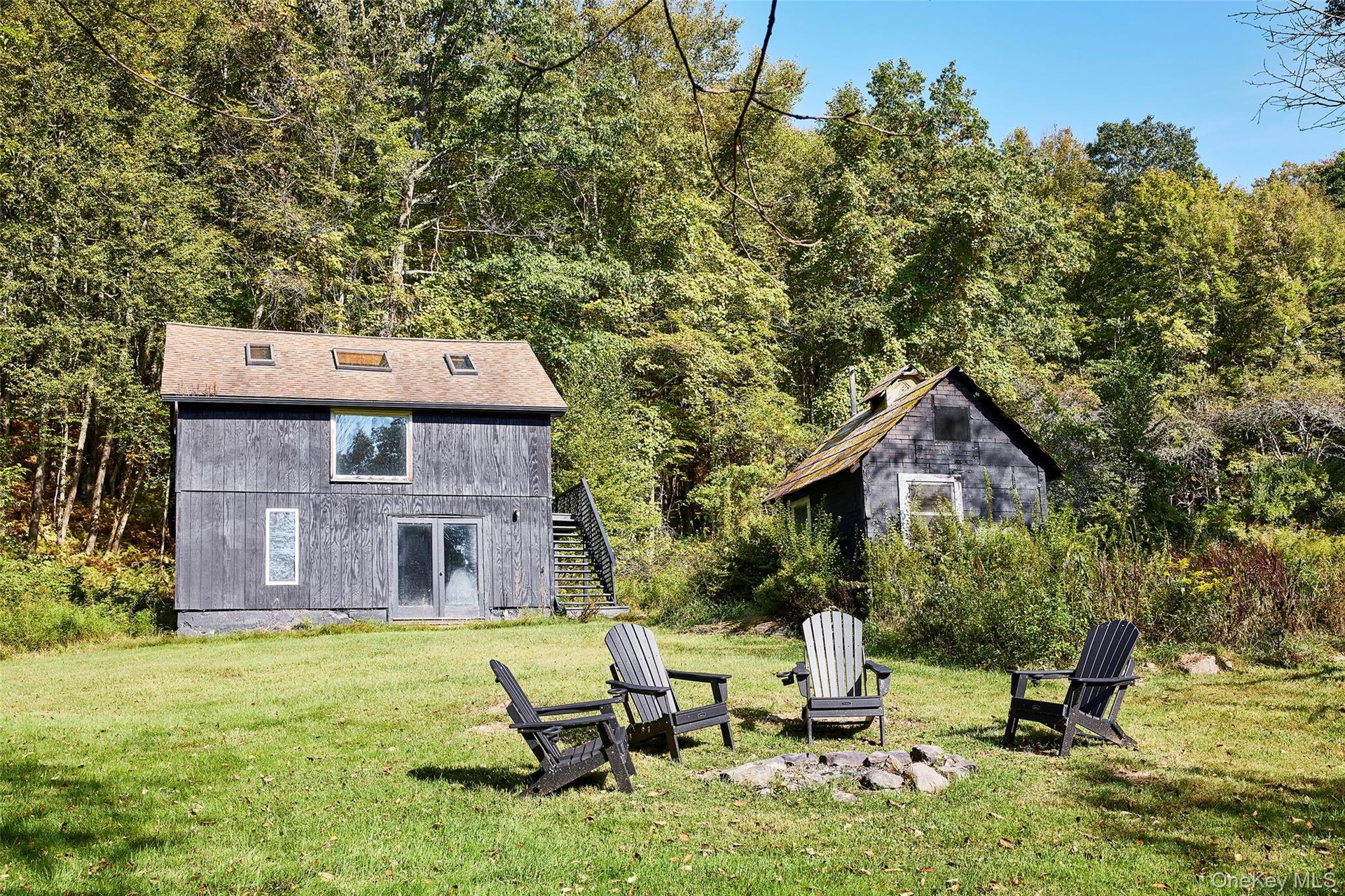 - Back of property featuring stairs, a fire pit, an outdoor structure, a lawn, and a forest view