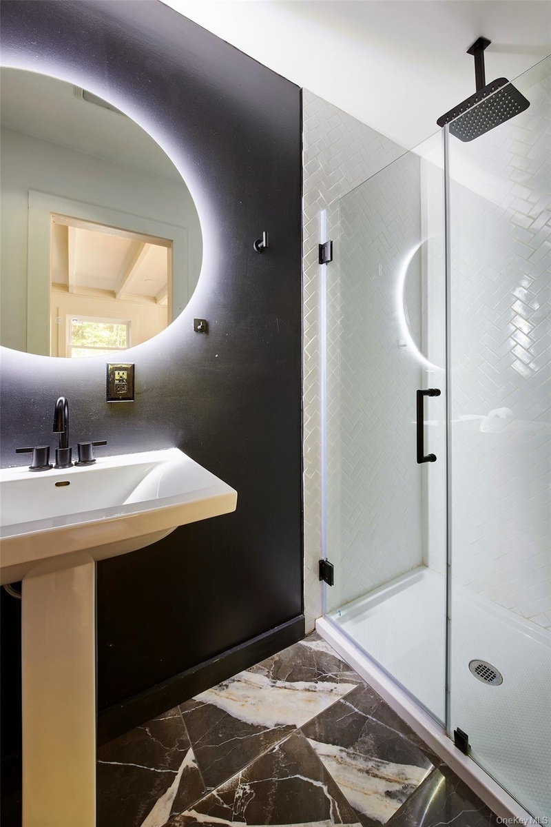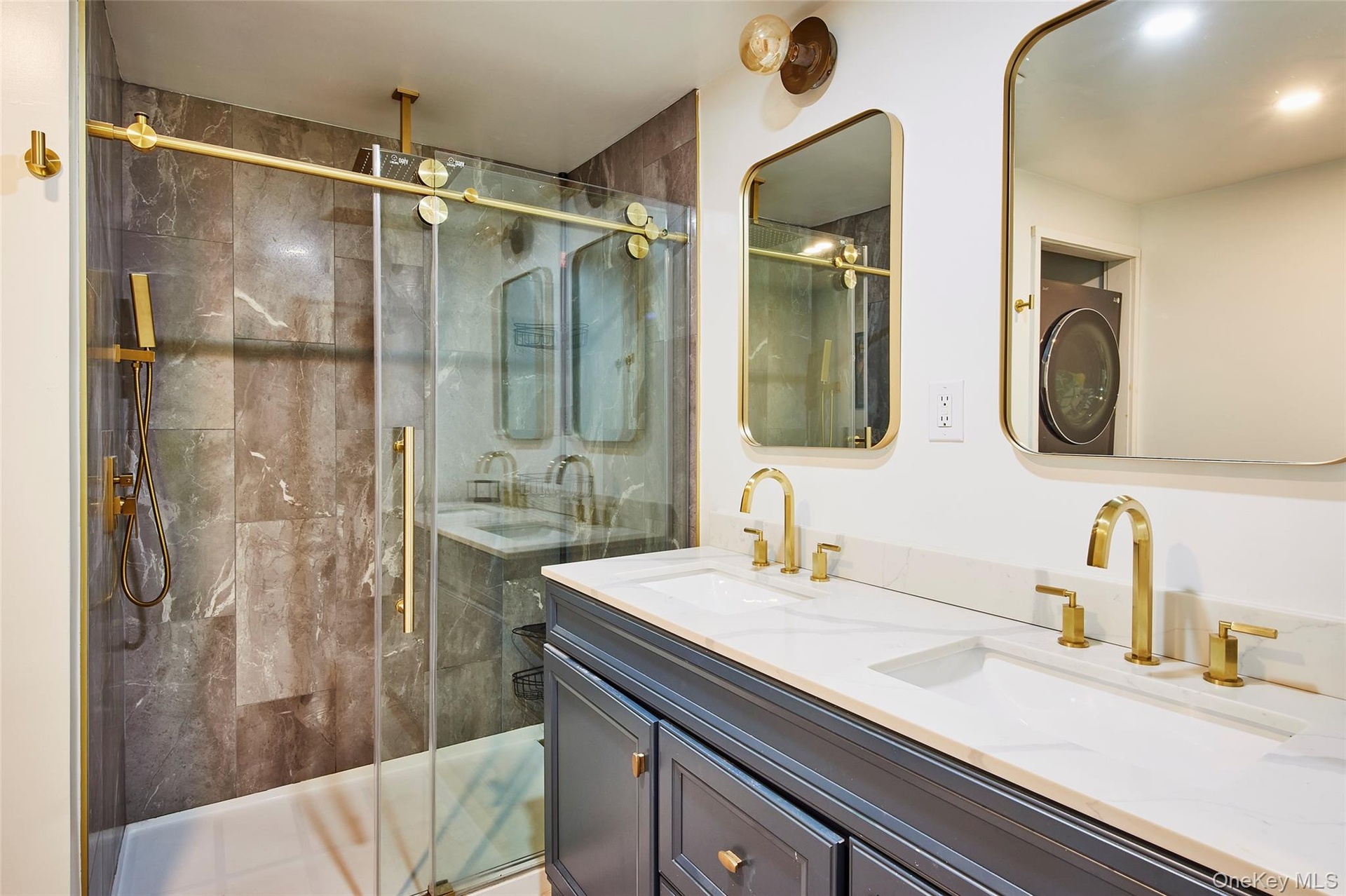 - Full bath featuring a marble finish shower, double vanity, and washer / clothes dryer