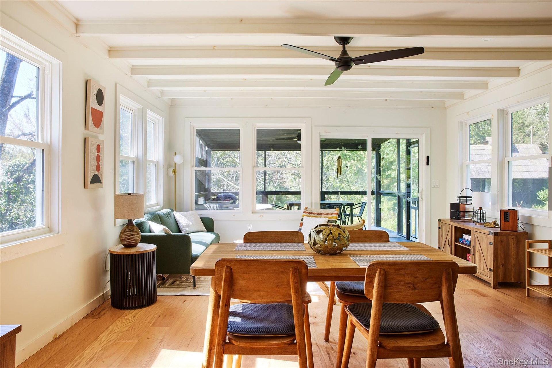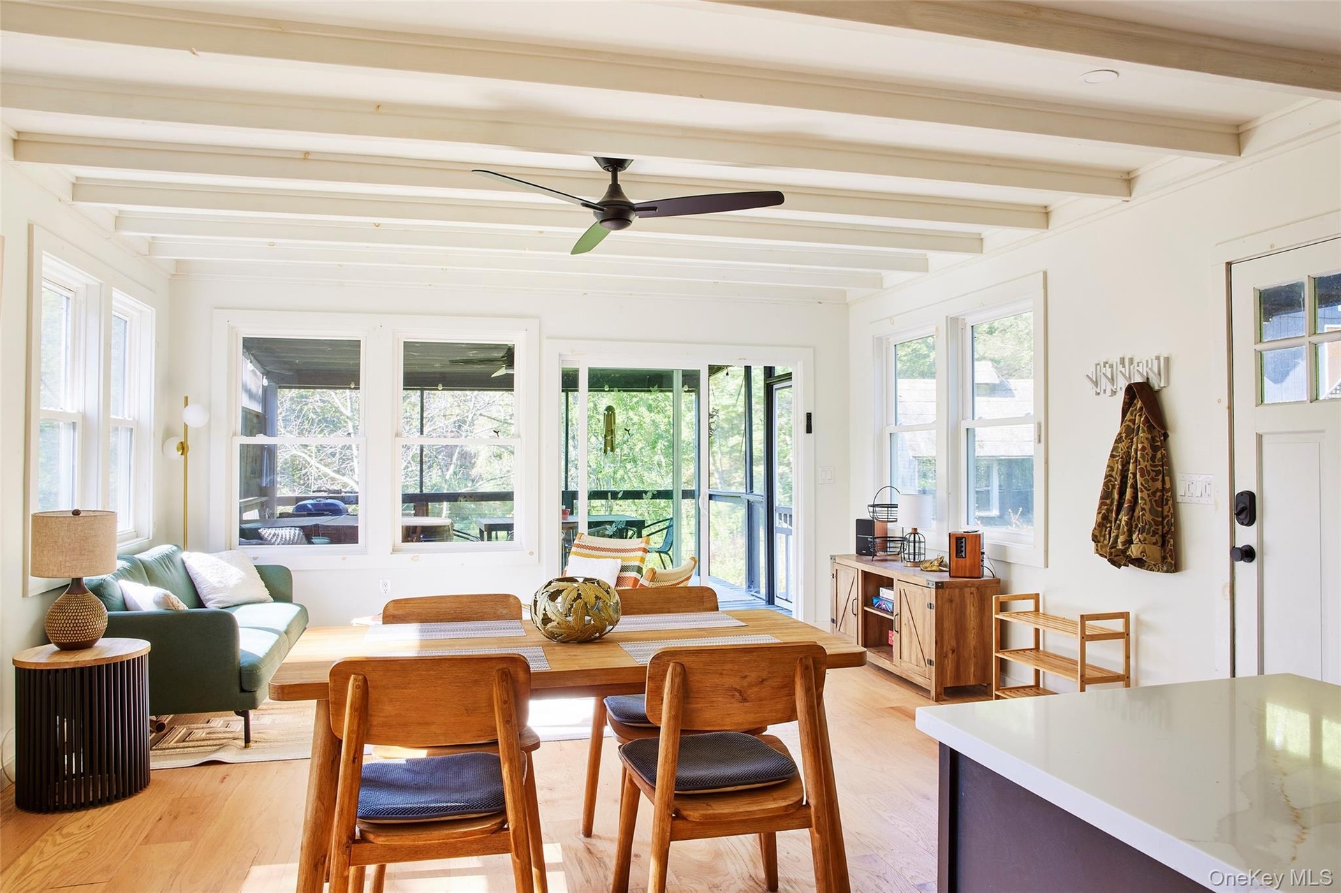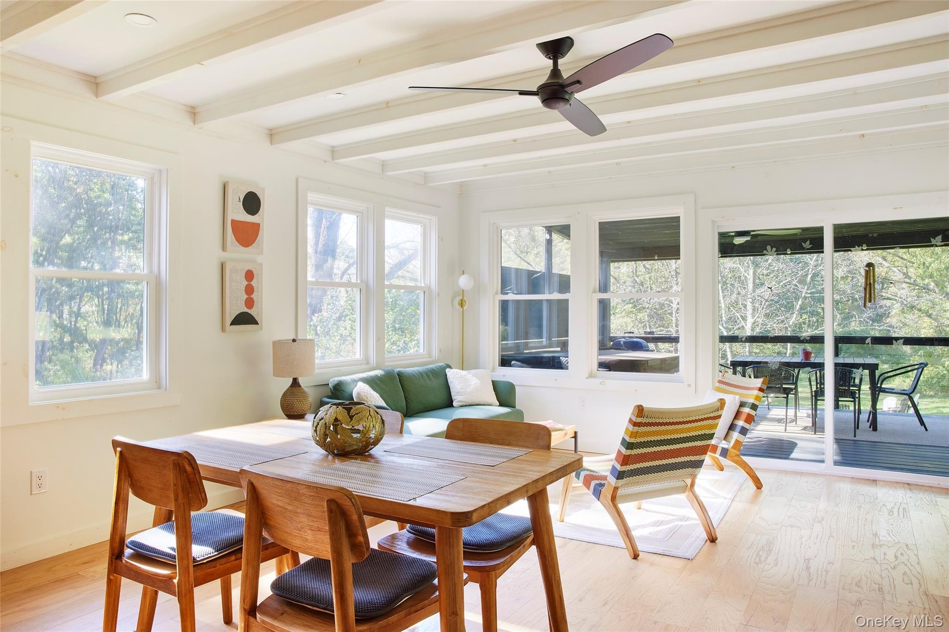 - Dining room with light wood-style flooring, beam ceiling, plenty of natural light, and ceiling fan