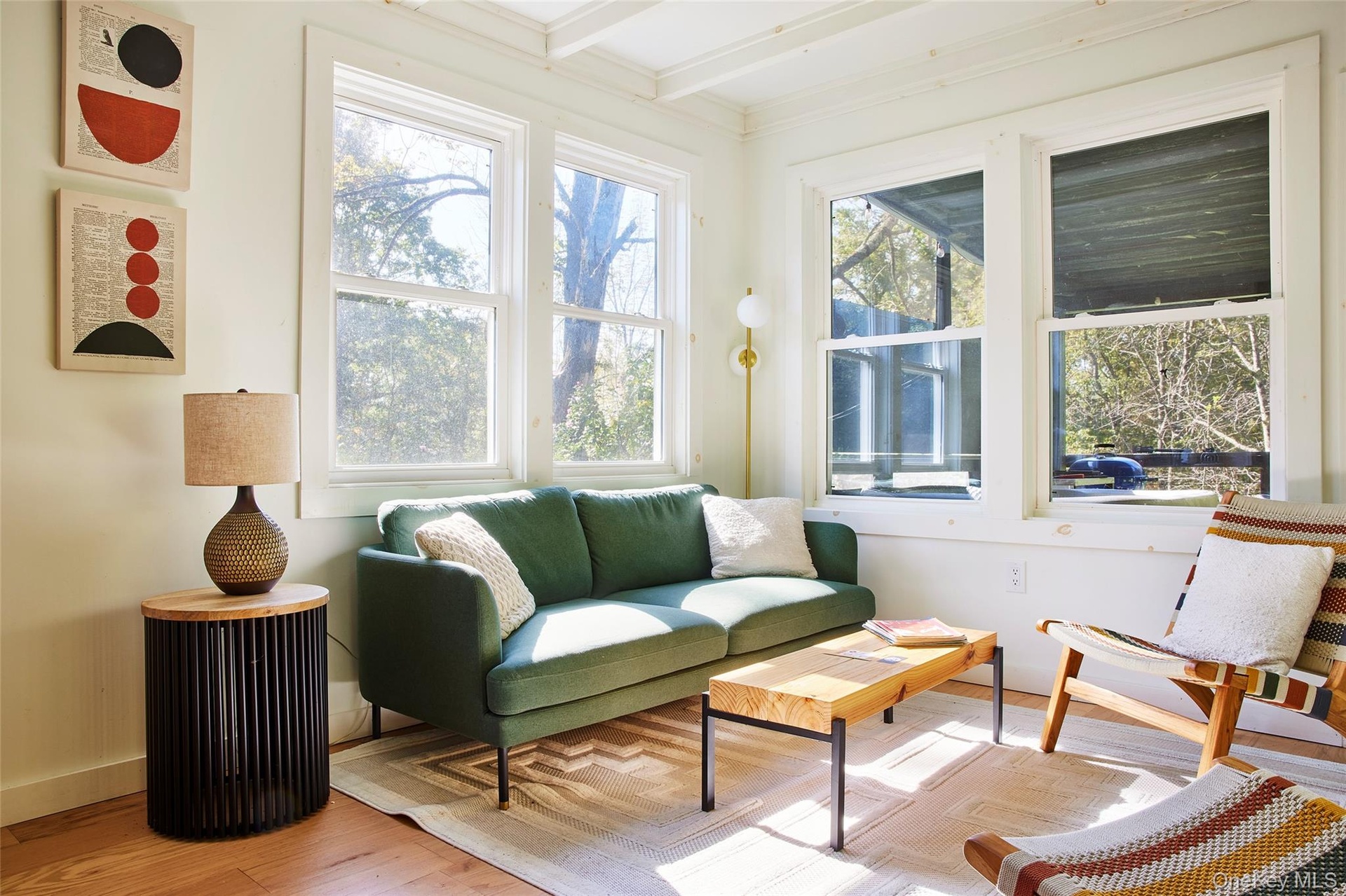 - Sunroom / solarium featuring wood finished floors and beam ceiling