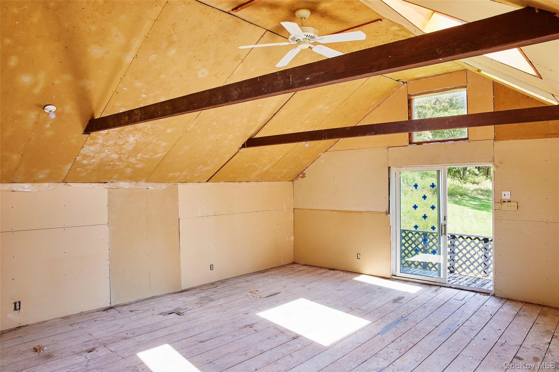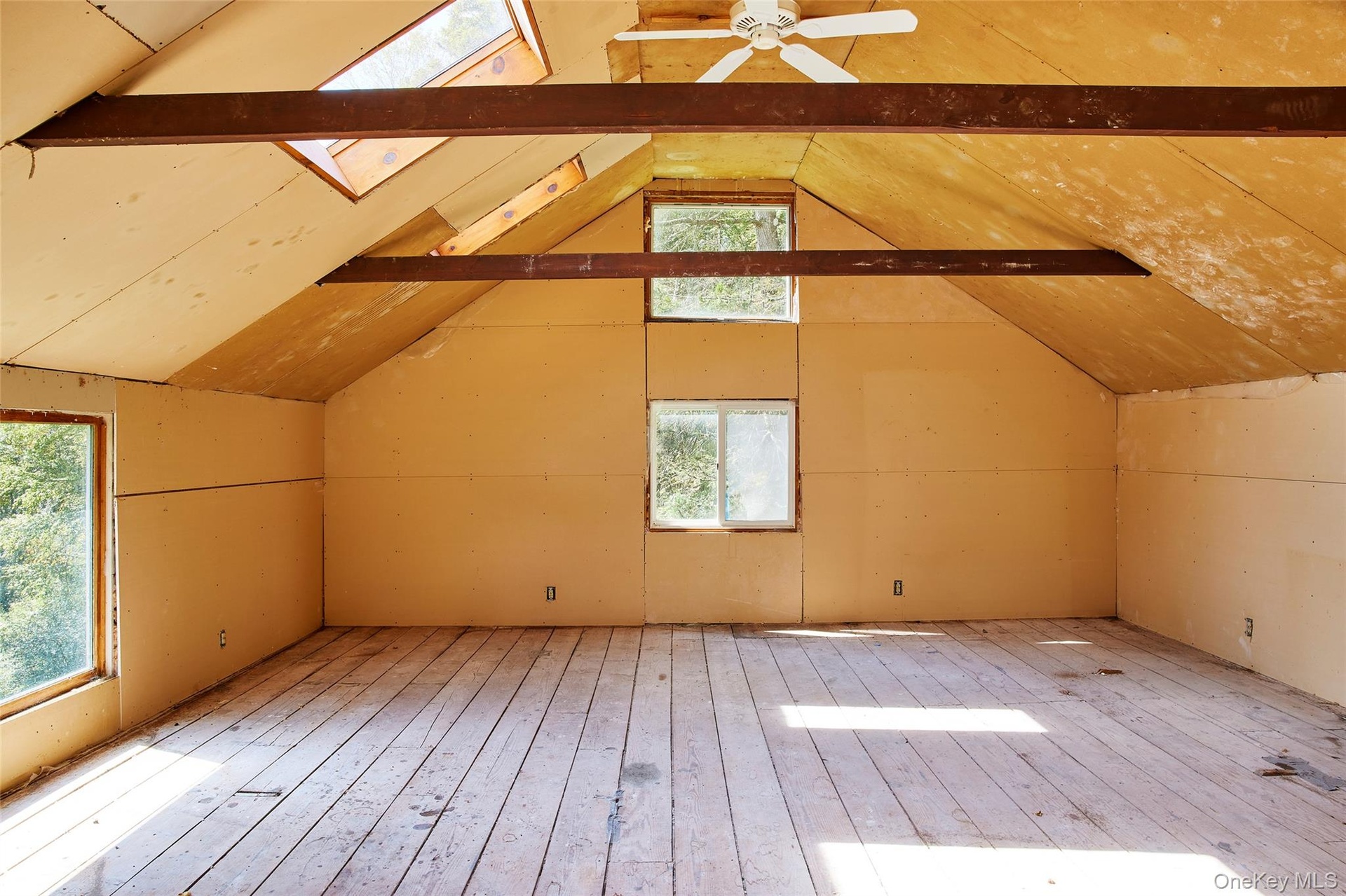 - Additional living space featuring hardwood / wood-style floors and ceiling fan