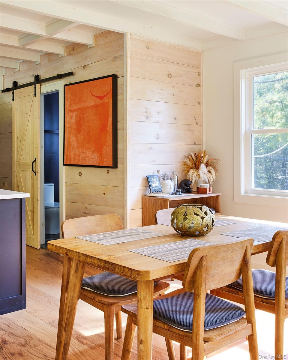 - Dining space with beamed ceiling, wood finished floors, wooden walls, and a barn door