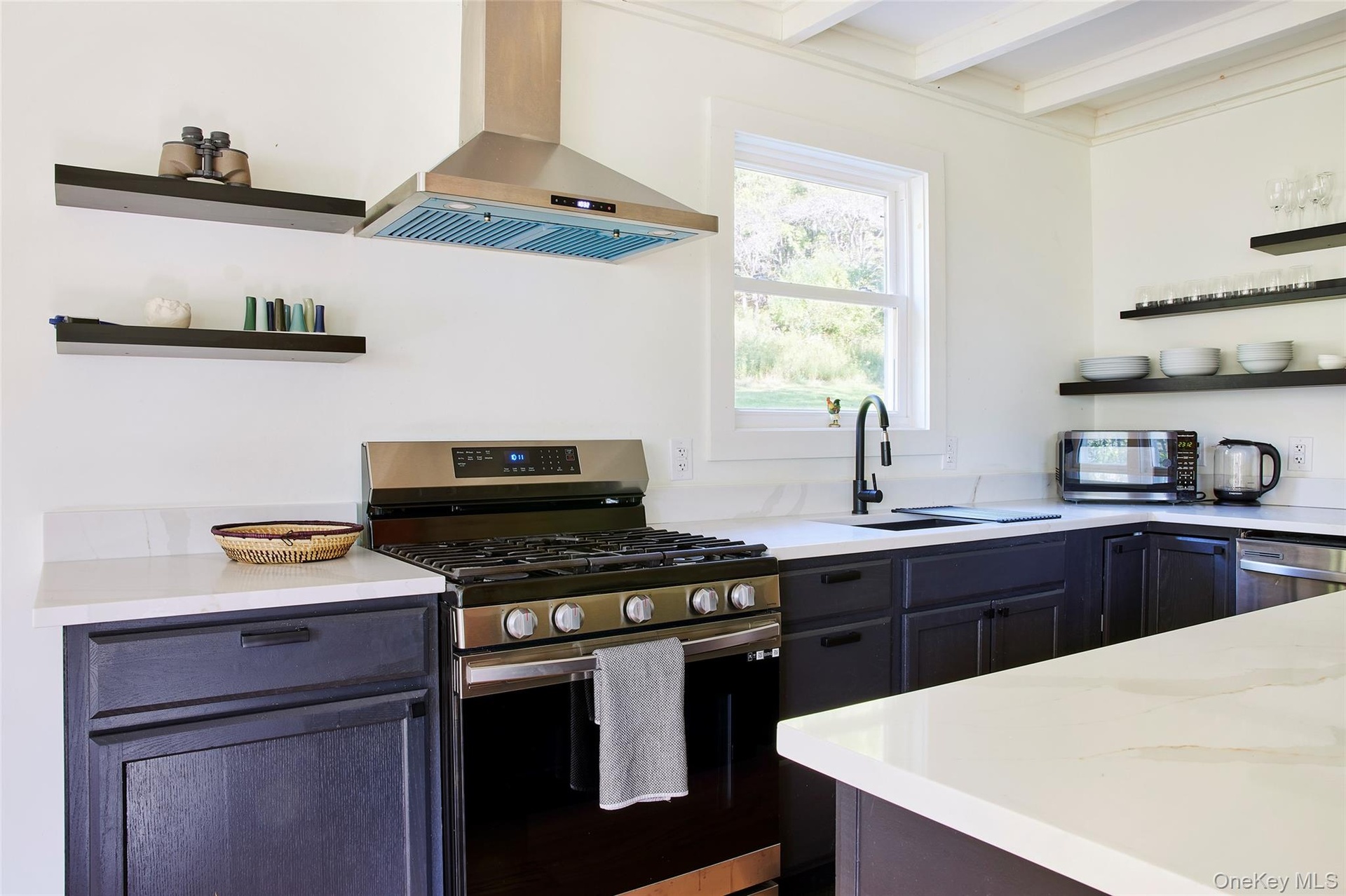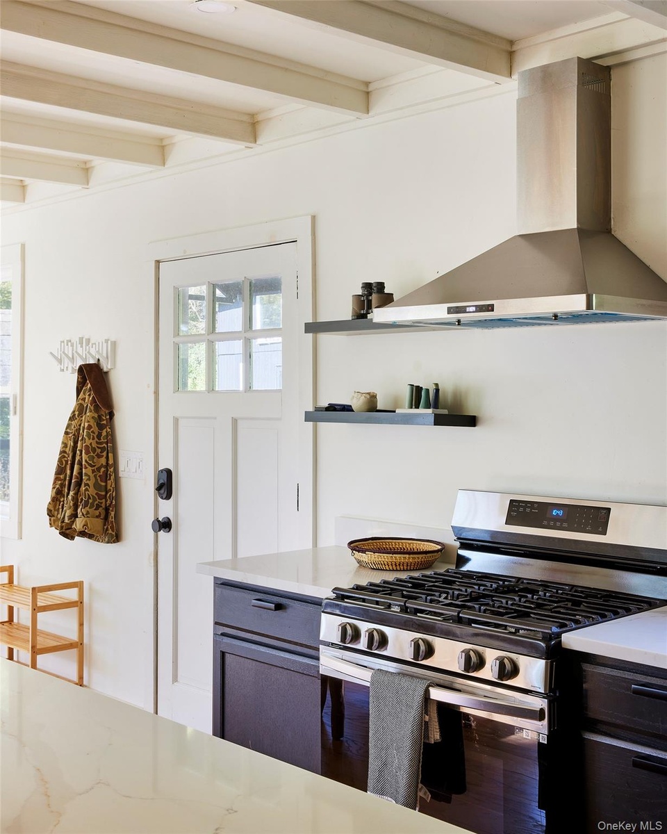 - Kitchen featuring stainless steel gas stove, wall chimney exhaust hood, beam ceiling, light stone countertops, and open shelves
