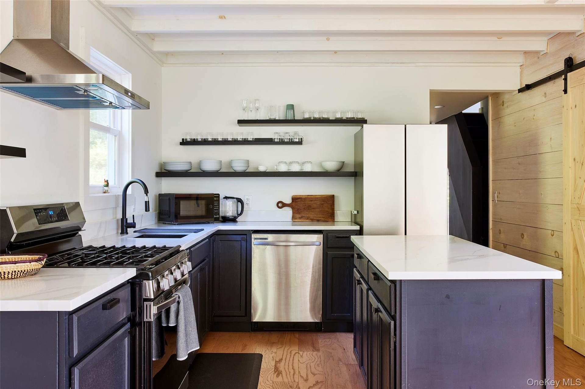 - Kitchen with open shelves, stainless steel appliances, wall chimney range hood, a barn door, and light wood-type flooring