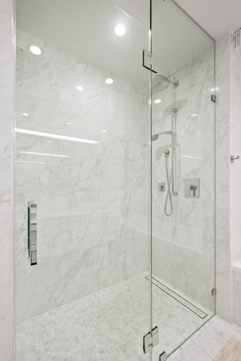 Serene primary and secondary baths are a retreat after a long day and a rejuvenating start to another one. Duravit deep-soaking tubs, white lacquer vanities with double sinks, and separate showers are wrapped in white marble floors and walls, grey limestone mosaic accents, Grohe fixtures, and radiant heated floors for a spa-like experience.