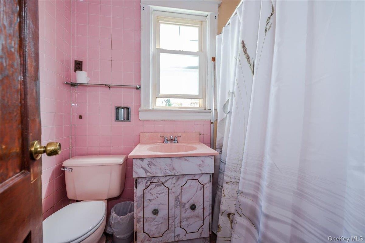 - Full bathroom featuring vanity, tile walls, and backsplash