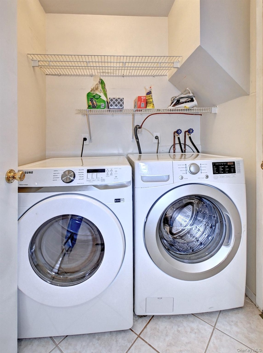 - Laundry room featuring light tile patterned flooring and washing machine and dryer
