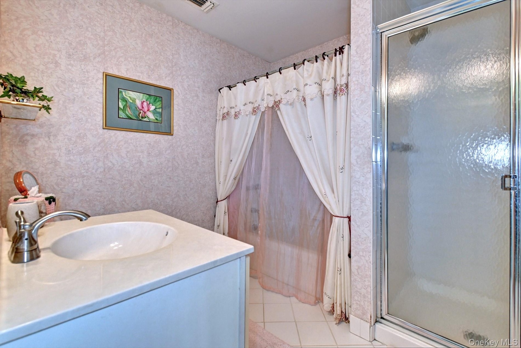 - Bathroom featuring light tile patterned flooring, a shower stall, vanity, and wallpapered walls