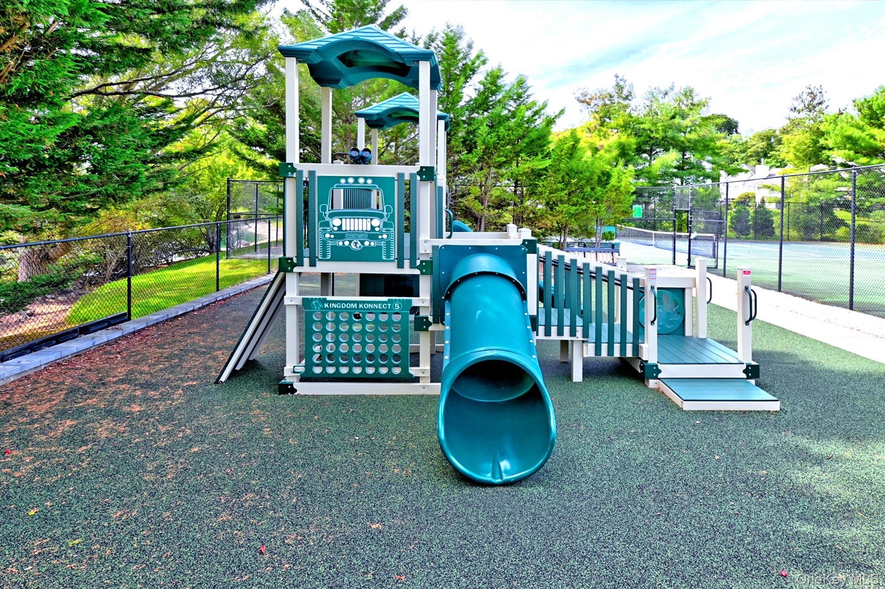 - Community playground with a tennis court and view of scattered trees