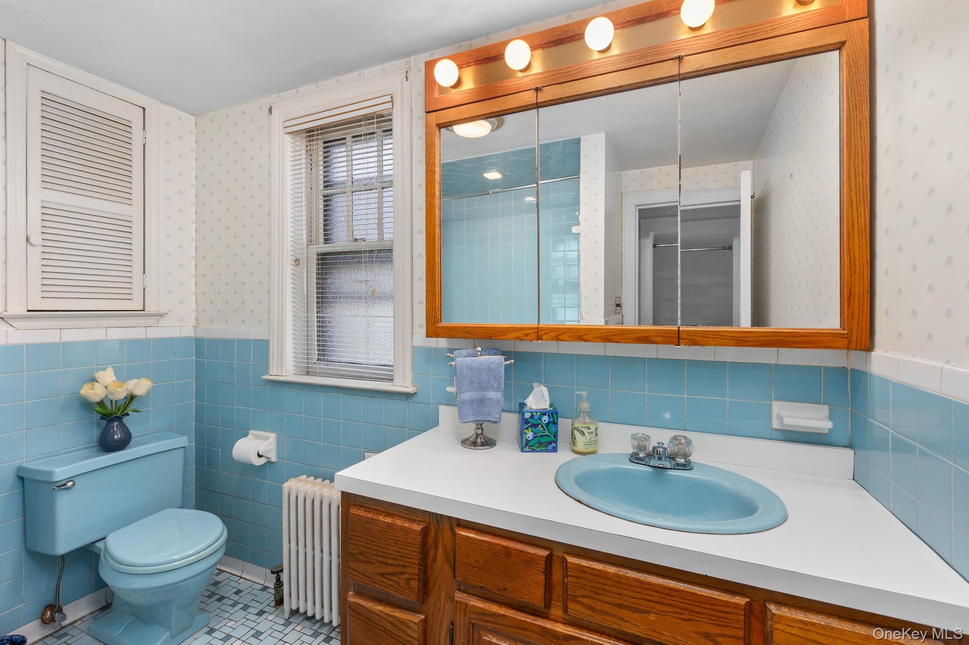 - Full bathroom featuring wallpapered walls, vanity, radiator heating unit, wainscoting, and tile walls