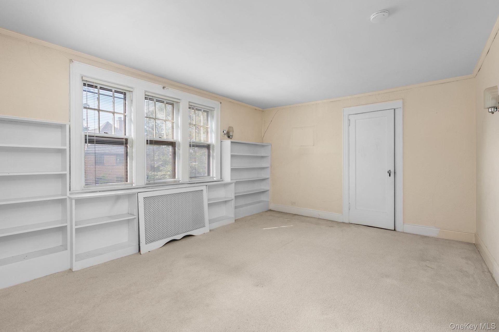 - Spare room with radiator heating unit, light colored carpet, and ornamental molding
