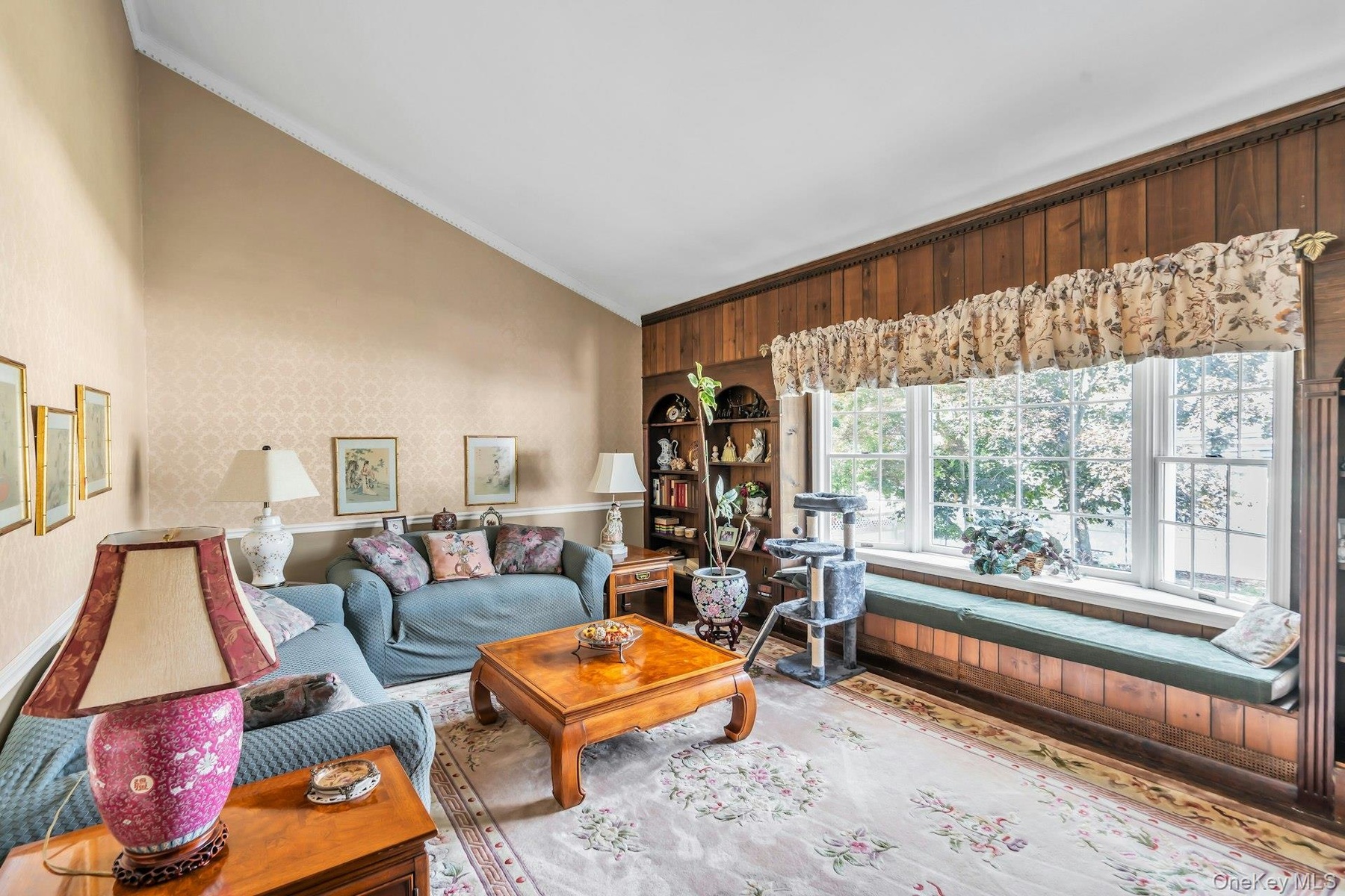 - Living room with vaulted ceiling, wallpapered walls, and crown molding